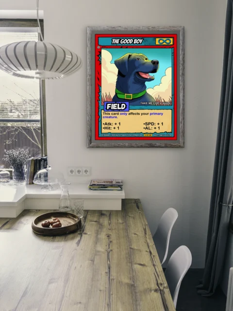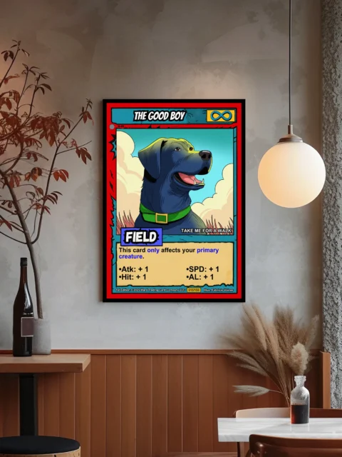 The cel-shaded illustration reads clearly from across the room. Card collectors and dog lovers will recognize the blend of CCG design and genuine Labrador personality. The the good boy trading card canvas print works as both gaming memorabilia and canine portrait.