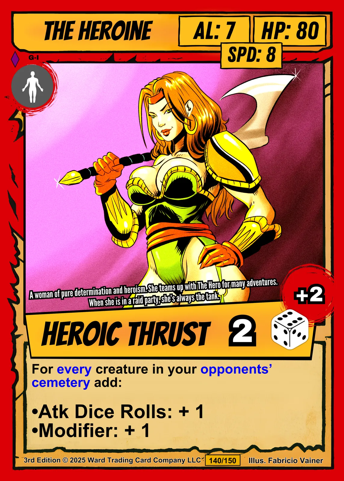 Additionally, the bold red border encloses yellow stat boxes at the top. Stats read AL: 7, HP: 80, and SPD: 8. An orange ability banner displays HEROIC THRUST with a dice icon showing 2.