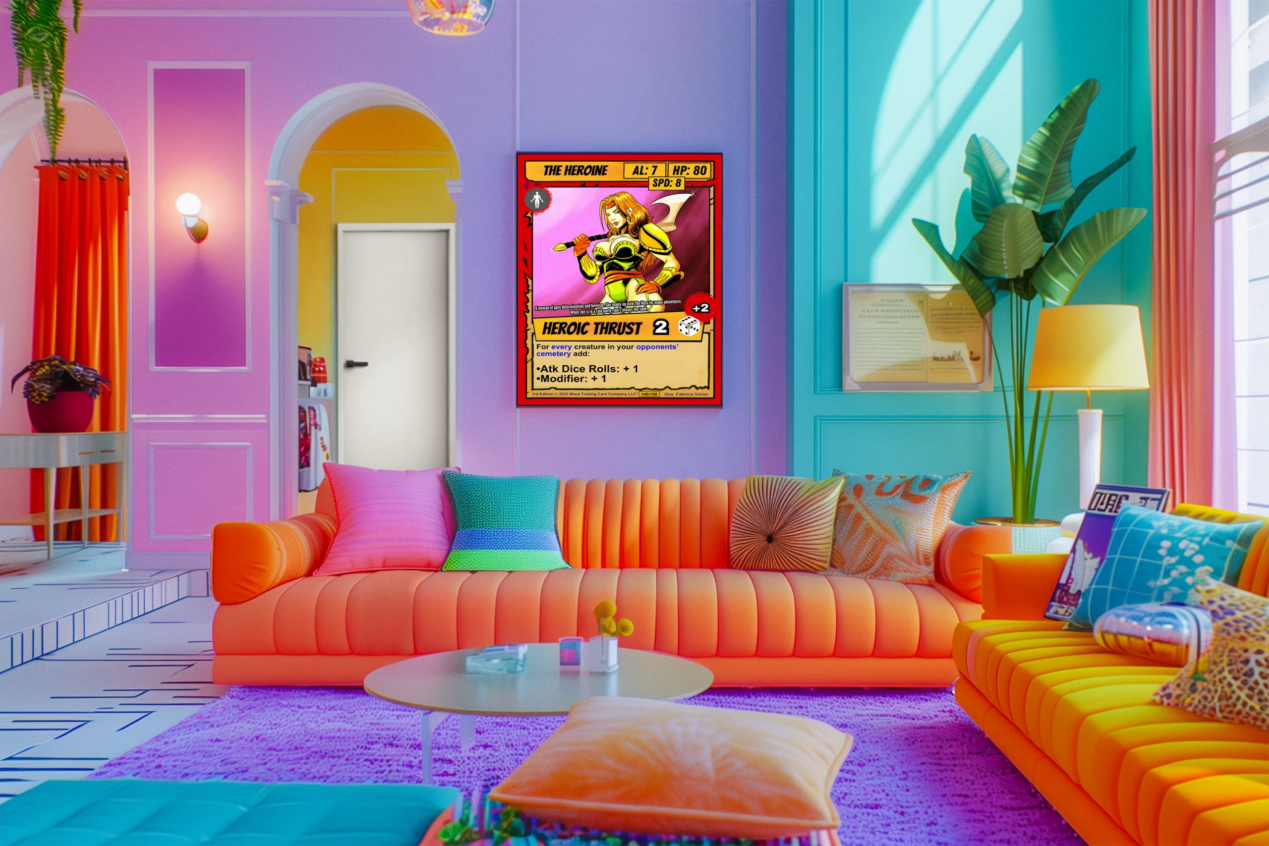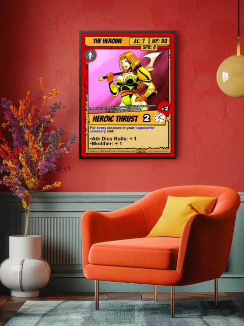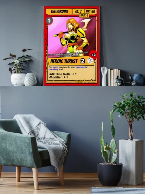 This piece works in game rooms where bold color palettes dominate. Additionally, it suits spaces dedicated to fantasy trading card collections.