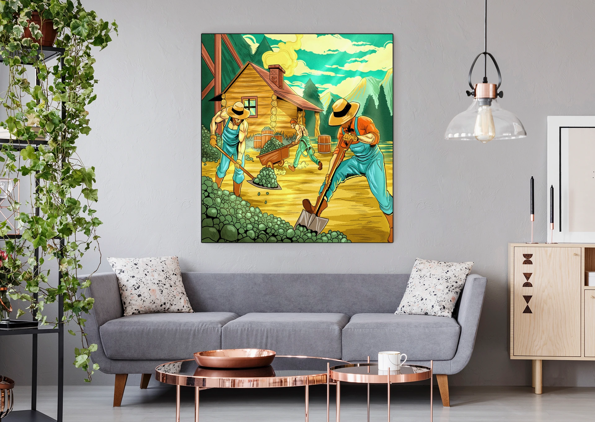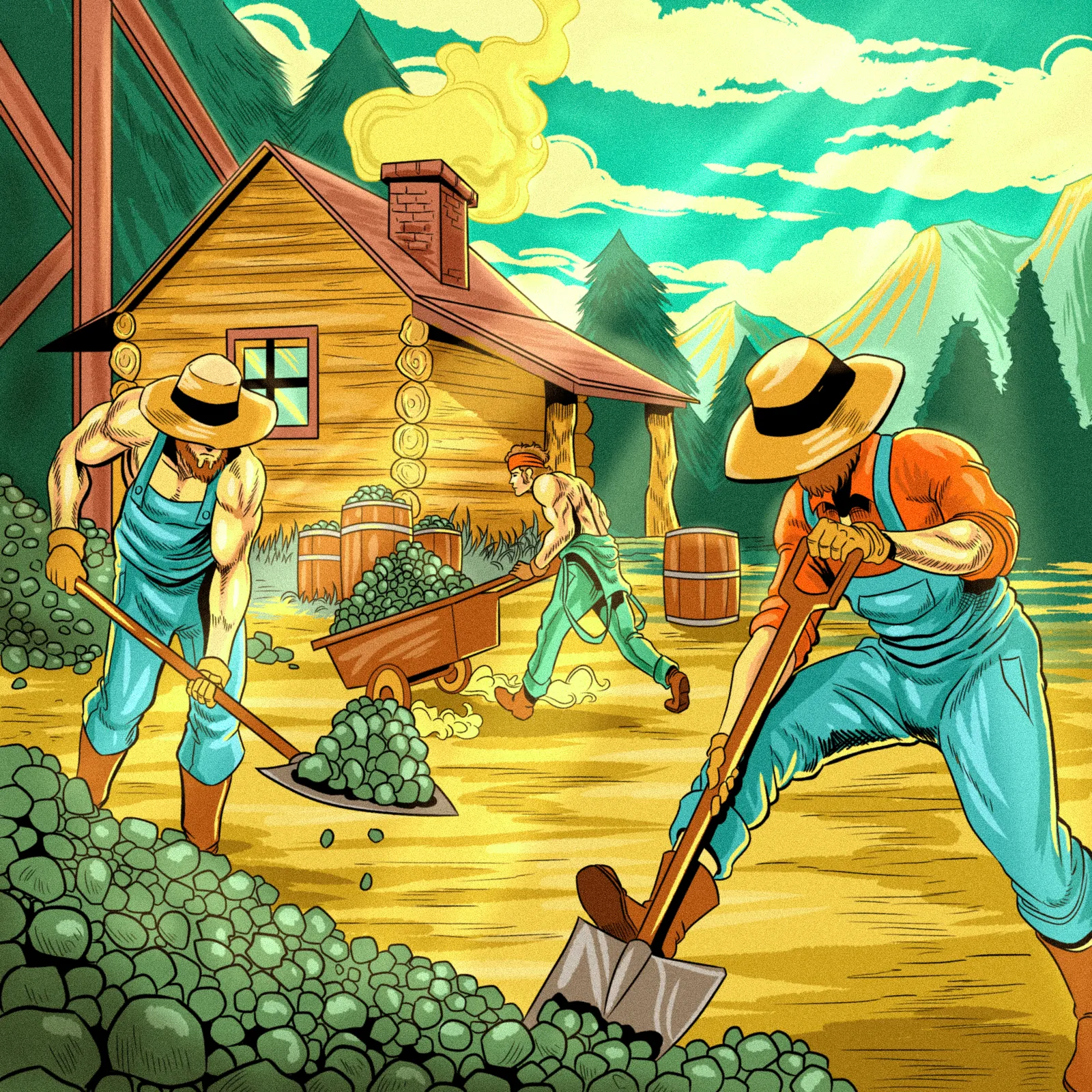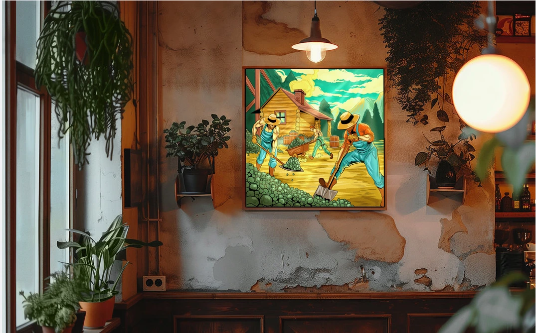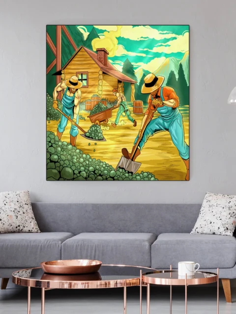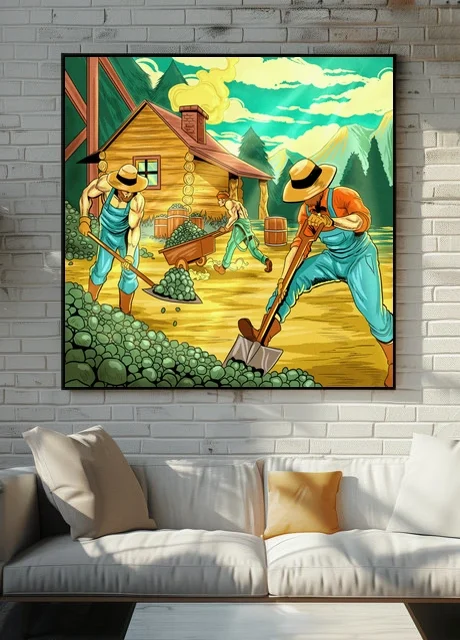 Three laborers shovel hop-like vegetation beside a rustic frontier cabin. The iron range art trading card art canvas print captures Fabricio Vainer’s vintage comic book illustration style. Notably, cross-hatching and stippling textures define every surface from overalls to mountainside.