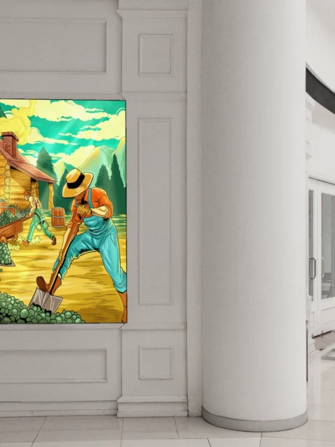 On the wall, the retro Americana palette reads like mid-century pulp fiction cover art. Ward TCG collectors and vintage illustration enthusiasts recognize Vainer’s deliberate compositional choices immediately. The iron range art trading card art canvas print delivers frontier labor energy without irony.