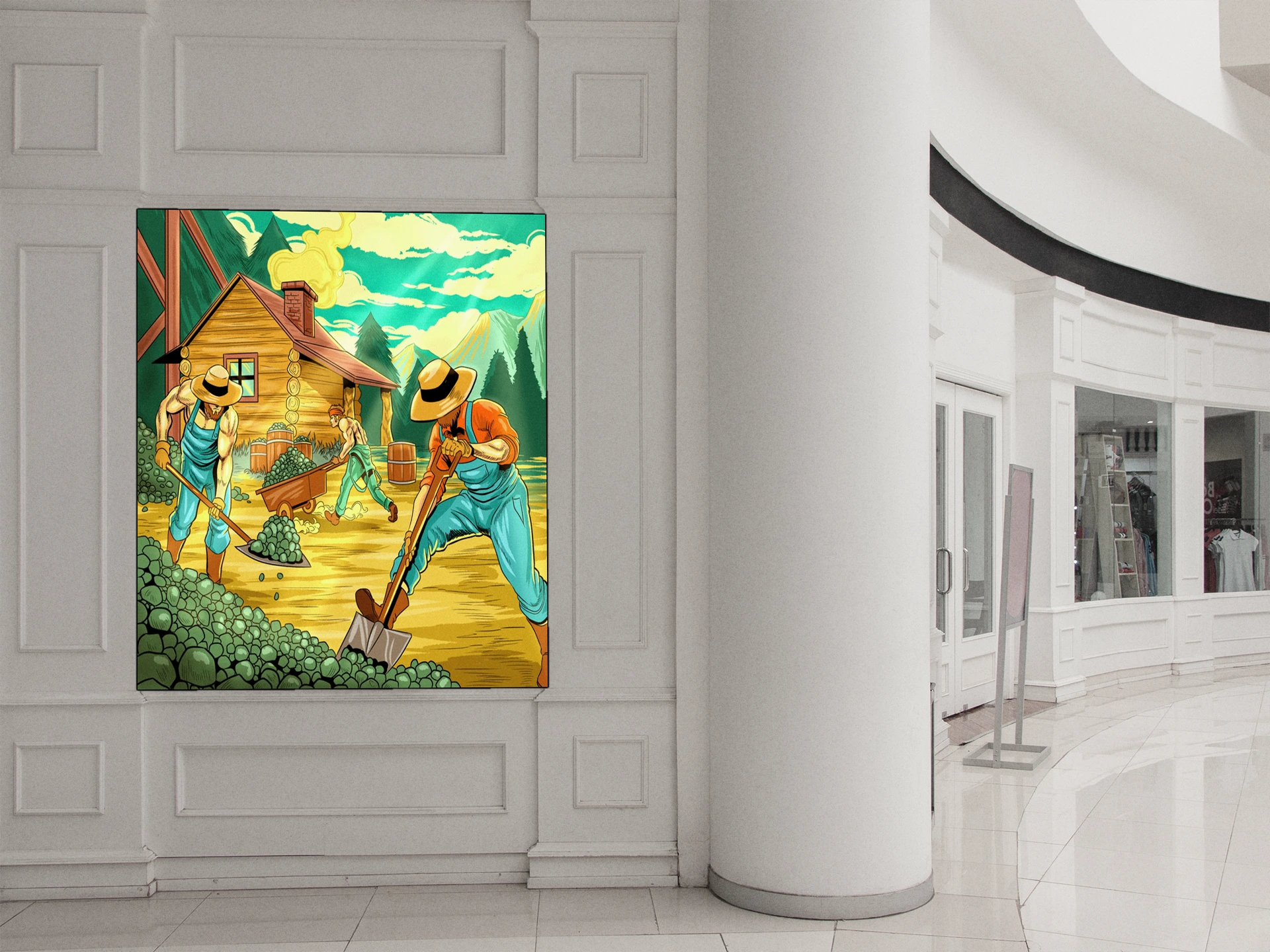 This belongs in game rooms where fantasy worldbuilding meets working-class frontier aesthetics. Additionally, it anchors creative studio walls where bold linework and limited palettes inspire character design.