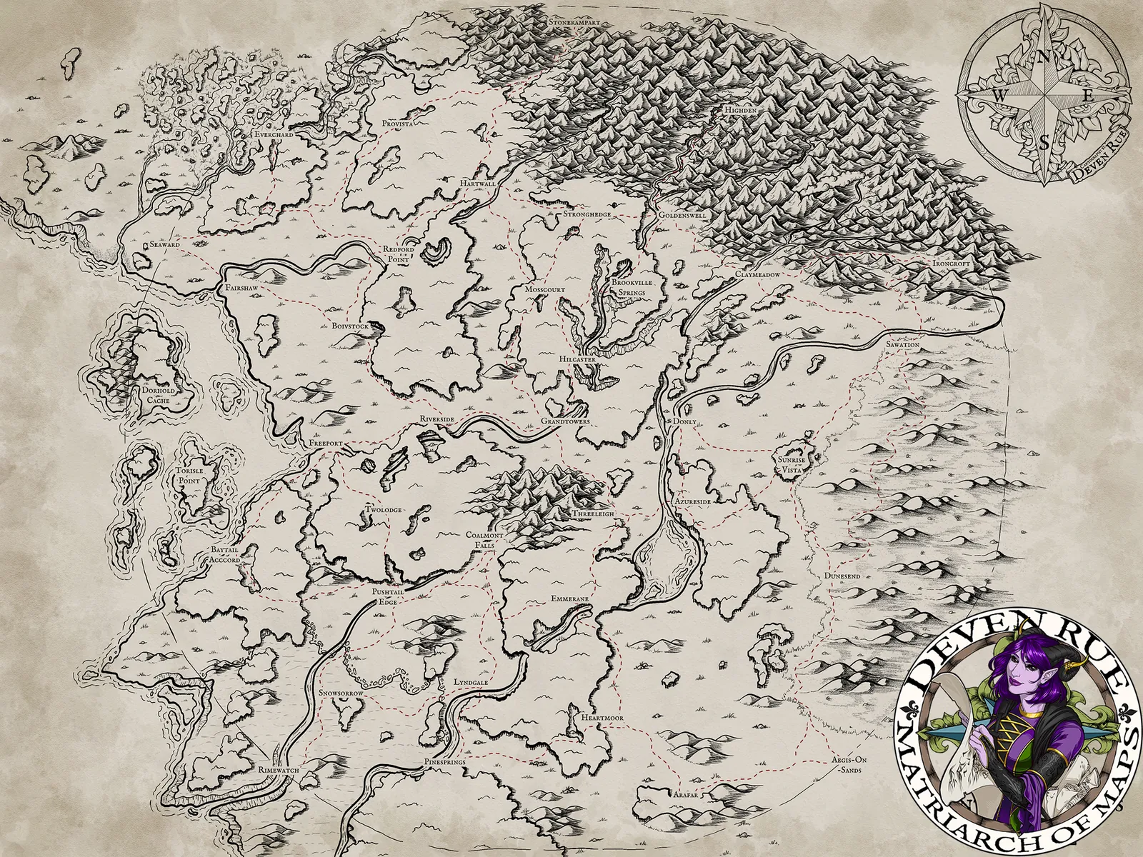 Additionally, the composition spreads dense highlands against open plains to create a clear sense of scale. However, winding rivers interrupt boundaries and pull the eye across multiple territories. Moreover, the overhead perspective supports strategic reading while preserving a hand-inked narrative style.