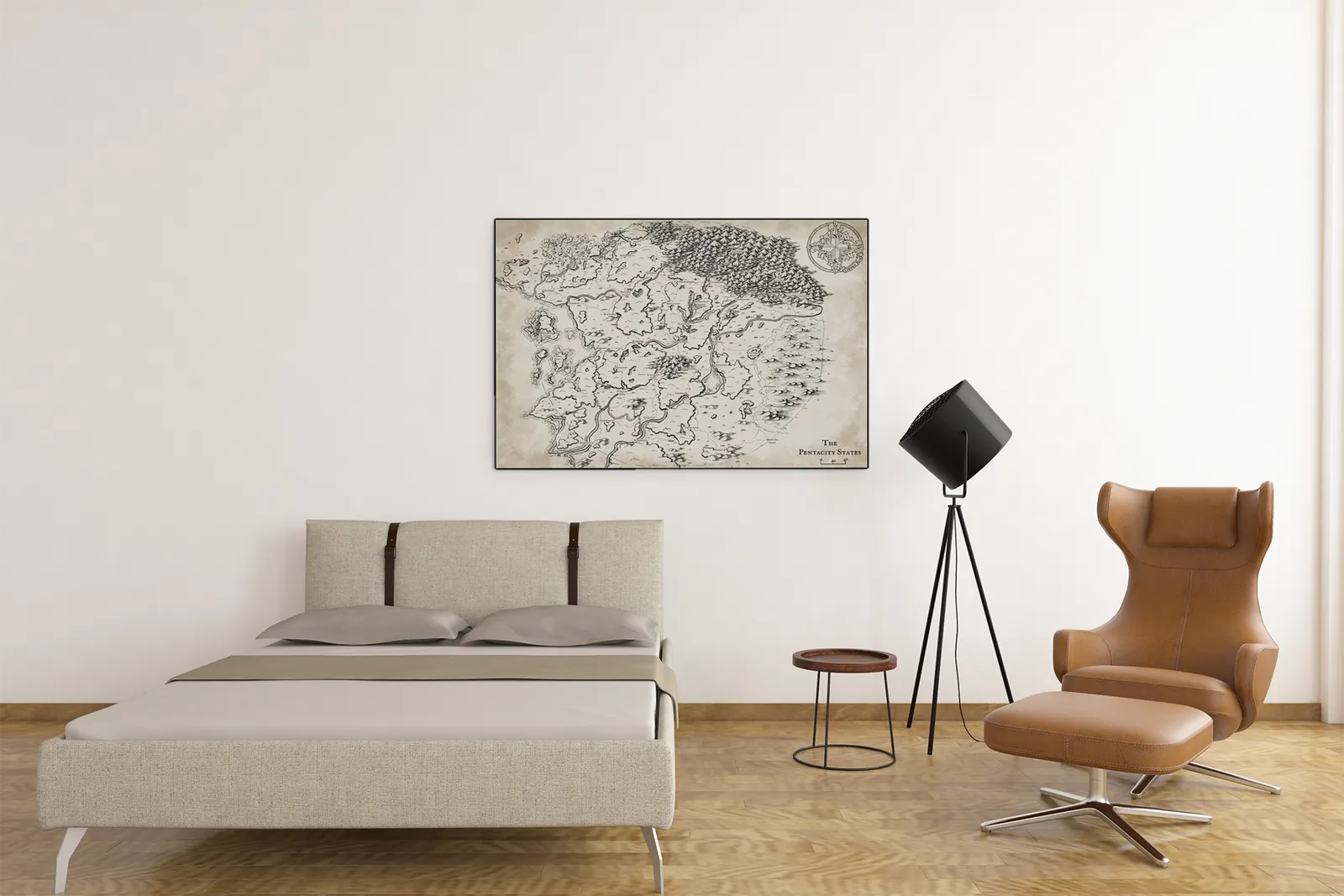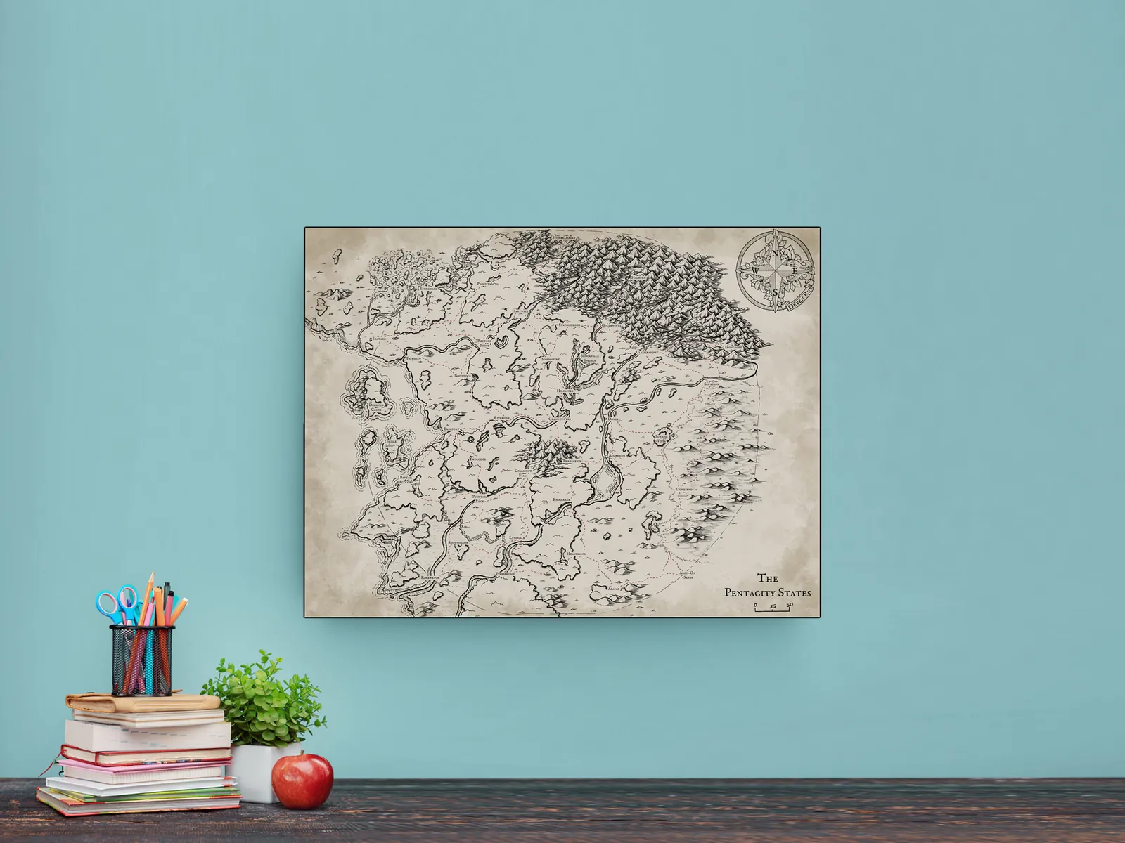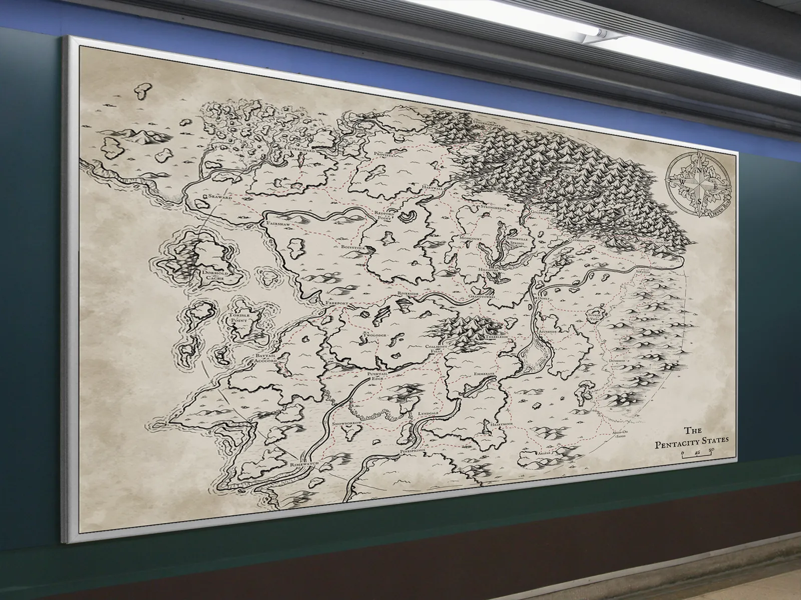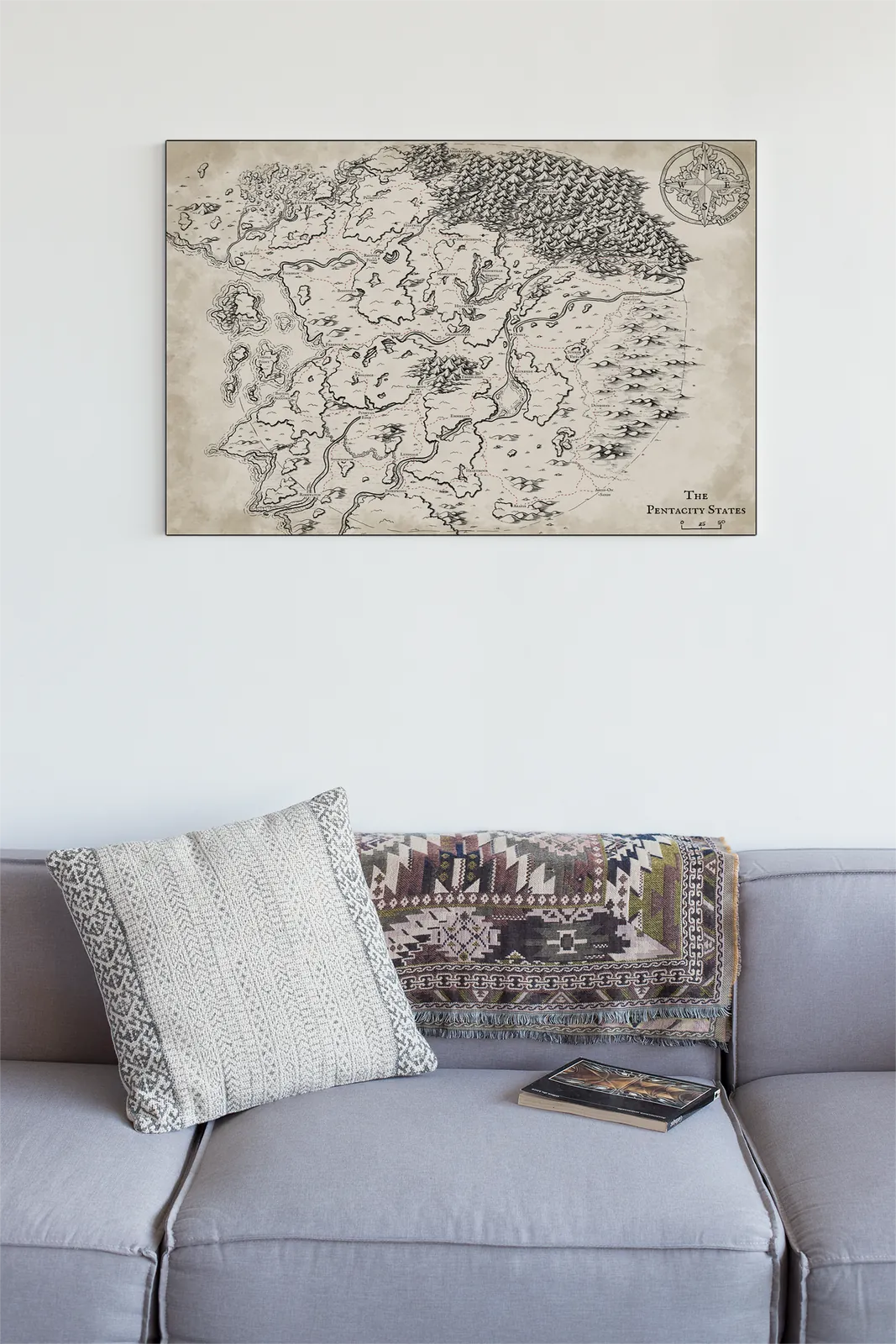 The Pentacity States Map lays out a divided realm where borders, rivers, and mountain ranges signal constant political strain. For anyone looking to showcase this setting in their space, Pentacity States Map canvas wall art offers a dramatic centerpiece. Moreover, marked routes and named regions imply fragile alliances and contested movement across the land. Consequently, the scene establishes threat and tension through geography alone.