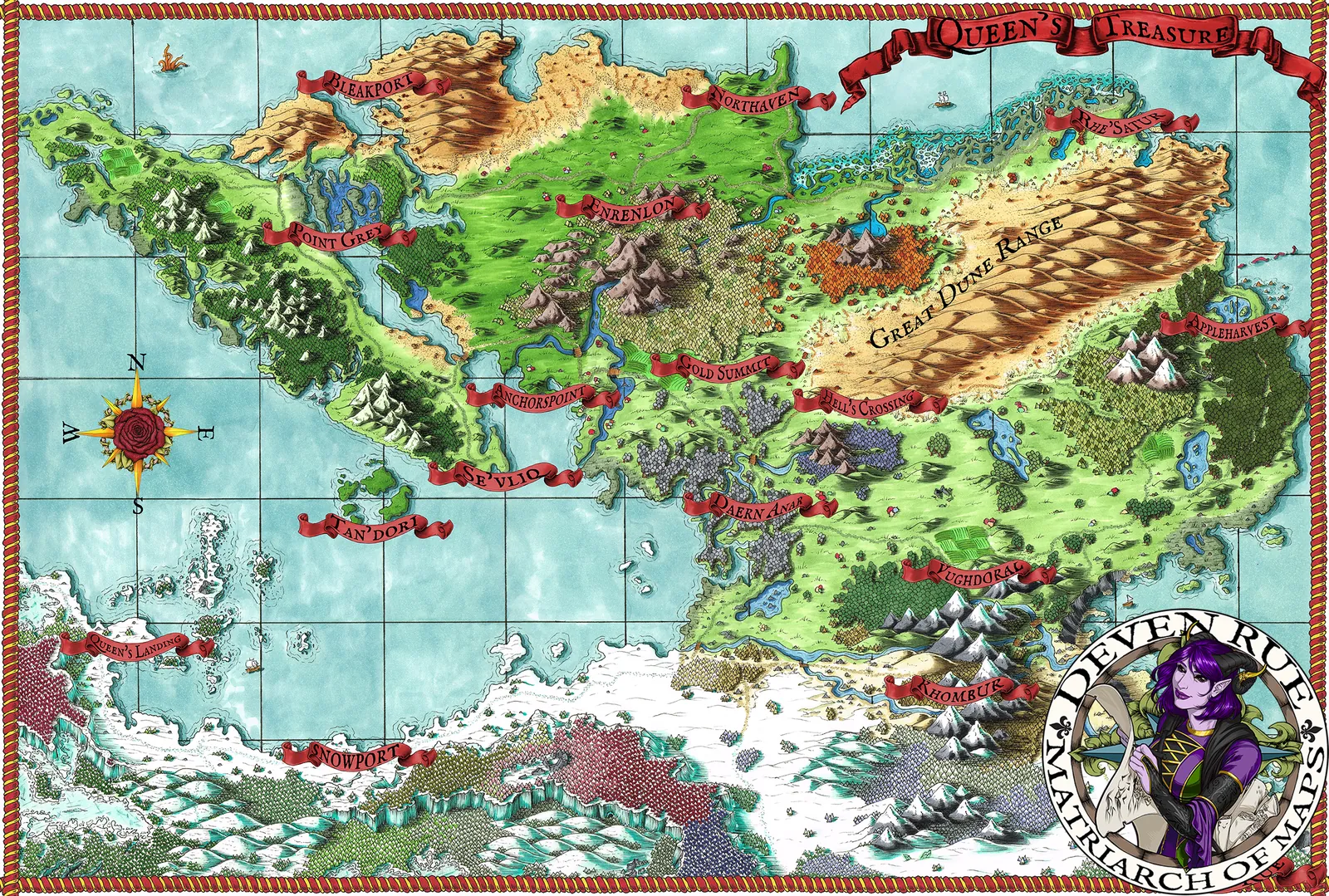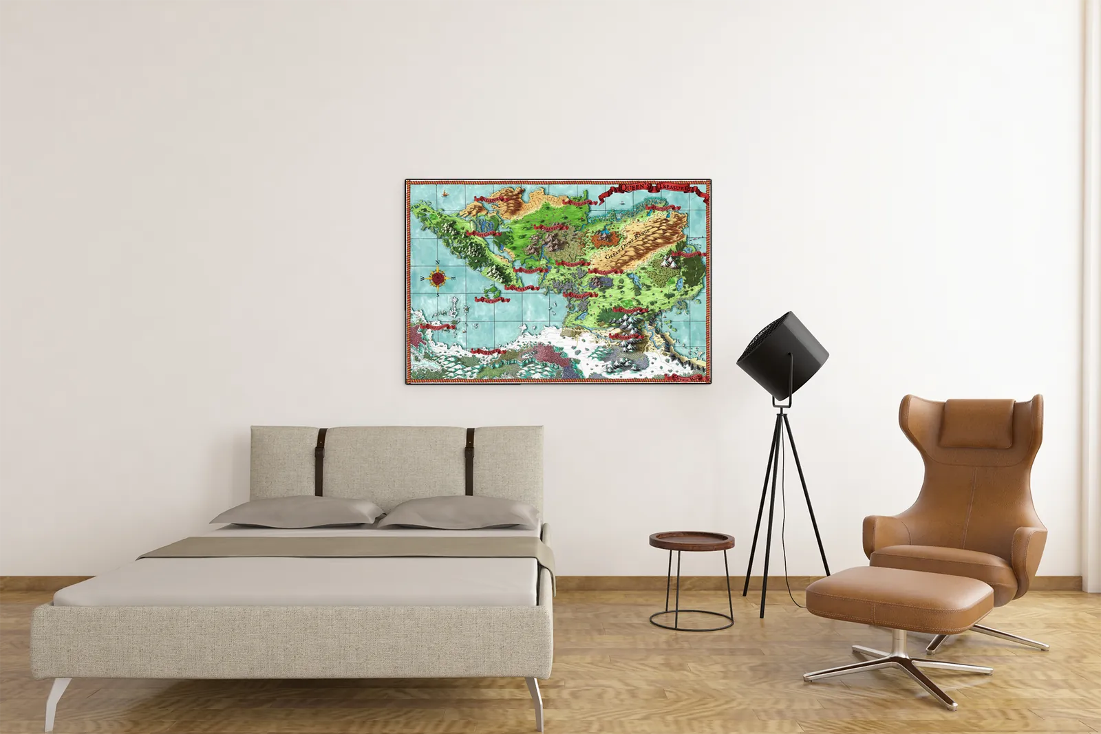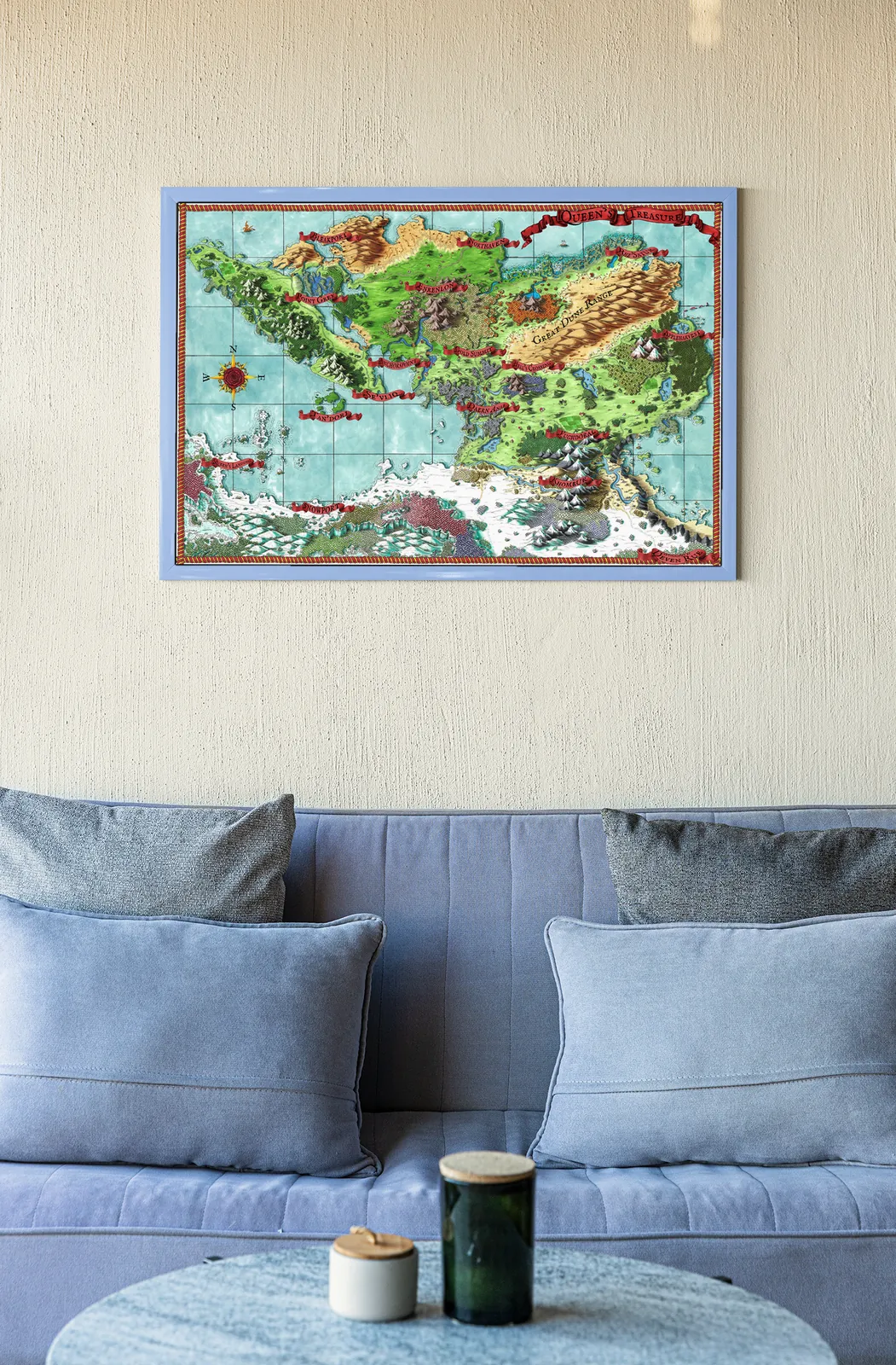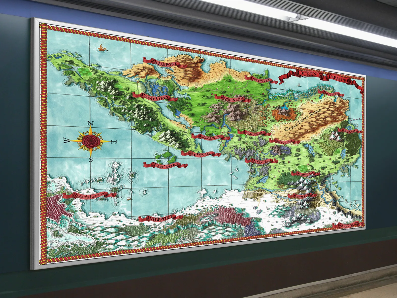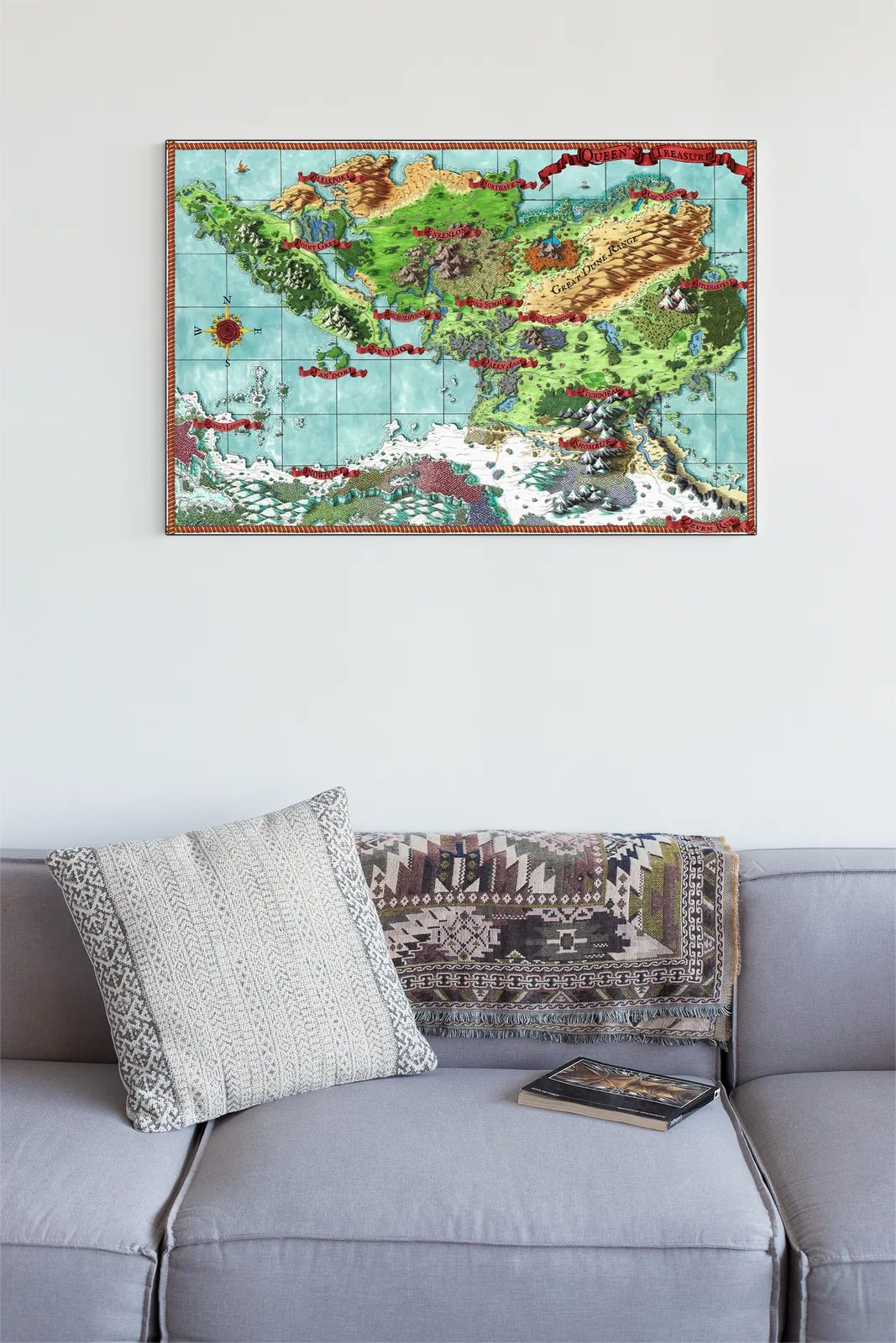 The Queen’s Treasure Map spreads a vast realm of rival coasts, fertile heartlands, and perilous frontiers tied together by ambition. If you’re seeking a unique piece for your home, the Queen’s Treasure Map canvas wall art brings this sense of adventure and rivalry to your living space. Moreover, named regions and sweeping borders hint at contested rule and fortunes waiting beyond guarded routes. Consequently, tension emerges through geography and scale rather than overt conflict.
