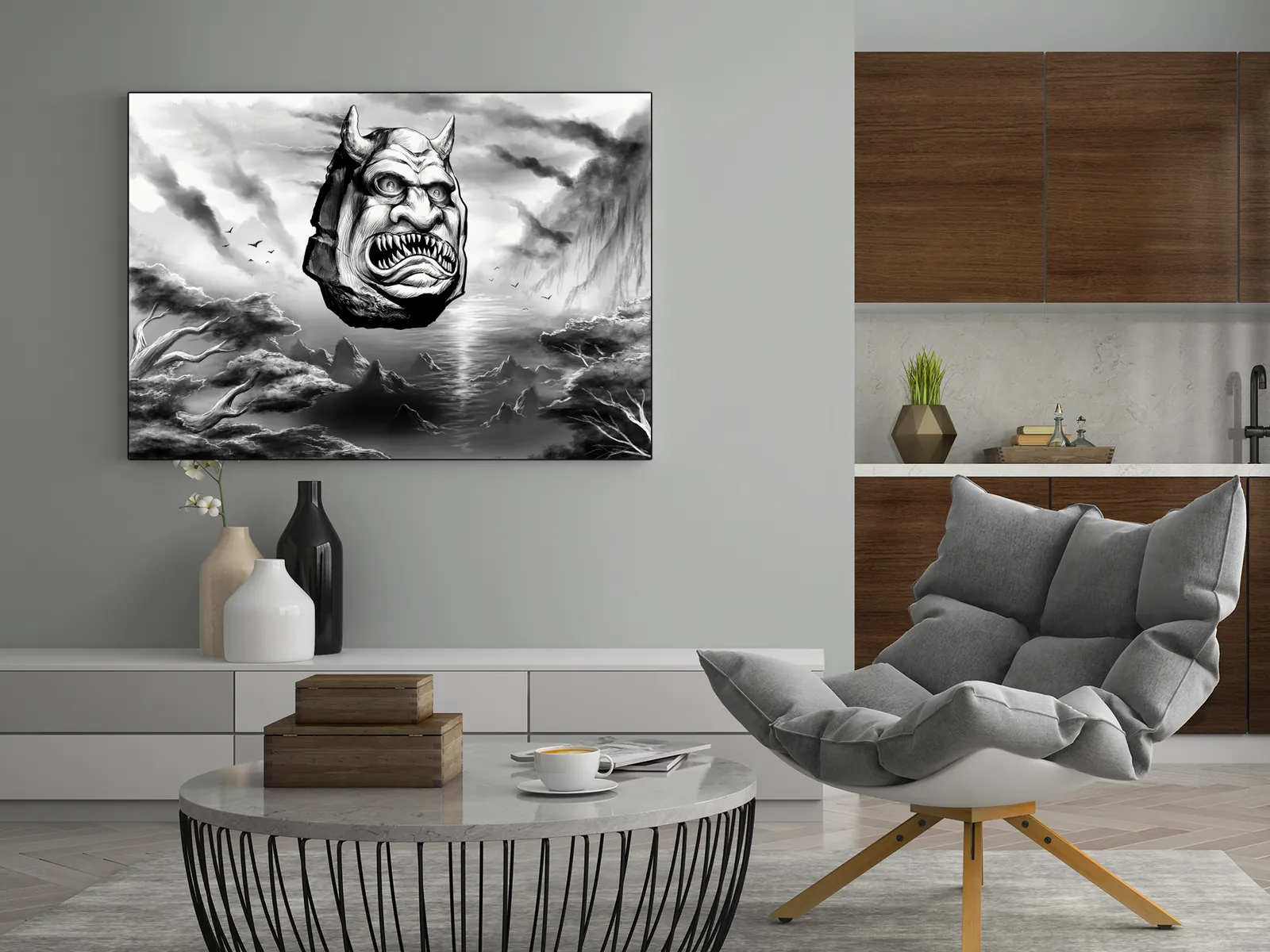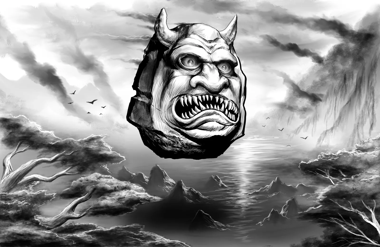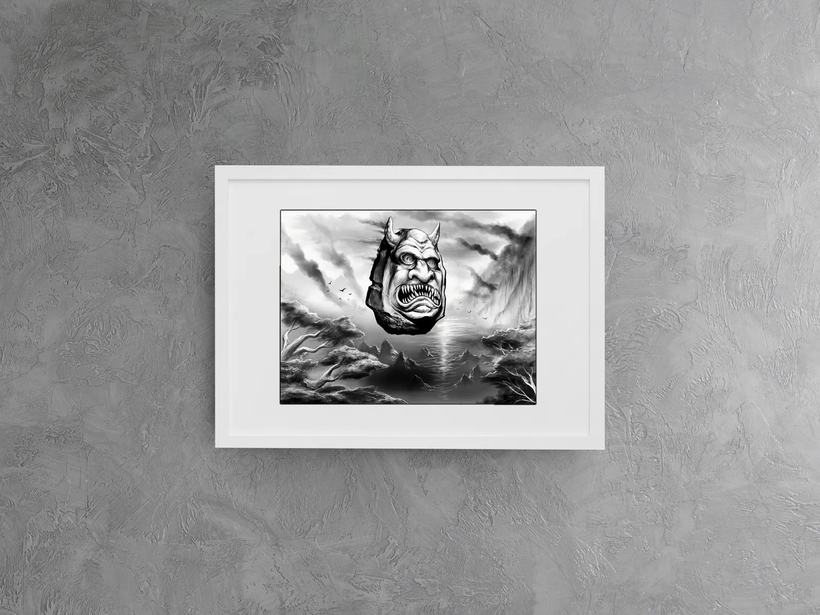 Additionally, the composition isolates the floating head against distant mountains and open sky, forcing attention onto its scale and expression. Sharp contours and exaggerated features guide the eye toward the bared teeth and hollow eyes. However, the surrounding emptiness heightens unease, suggesting power that needs no body.