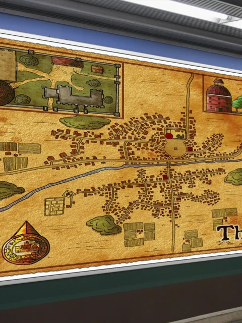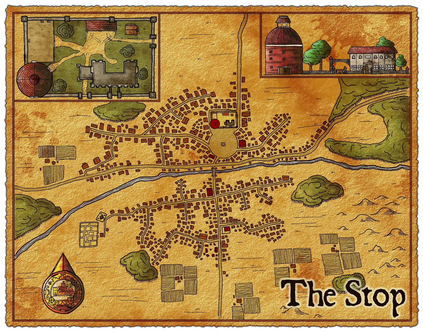 Furthermore, organic street patterns radiate from the central plaza in hand-drawn ink lines. The blue river cuts horizontally through red-brown buildings and scattered farm structures. Indeed, golden border framing and heraldic shield details complete the cartographic aesthetic.