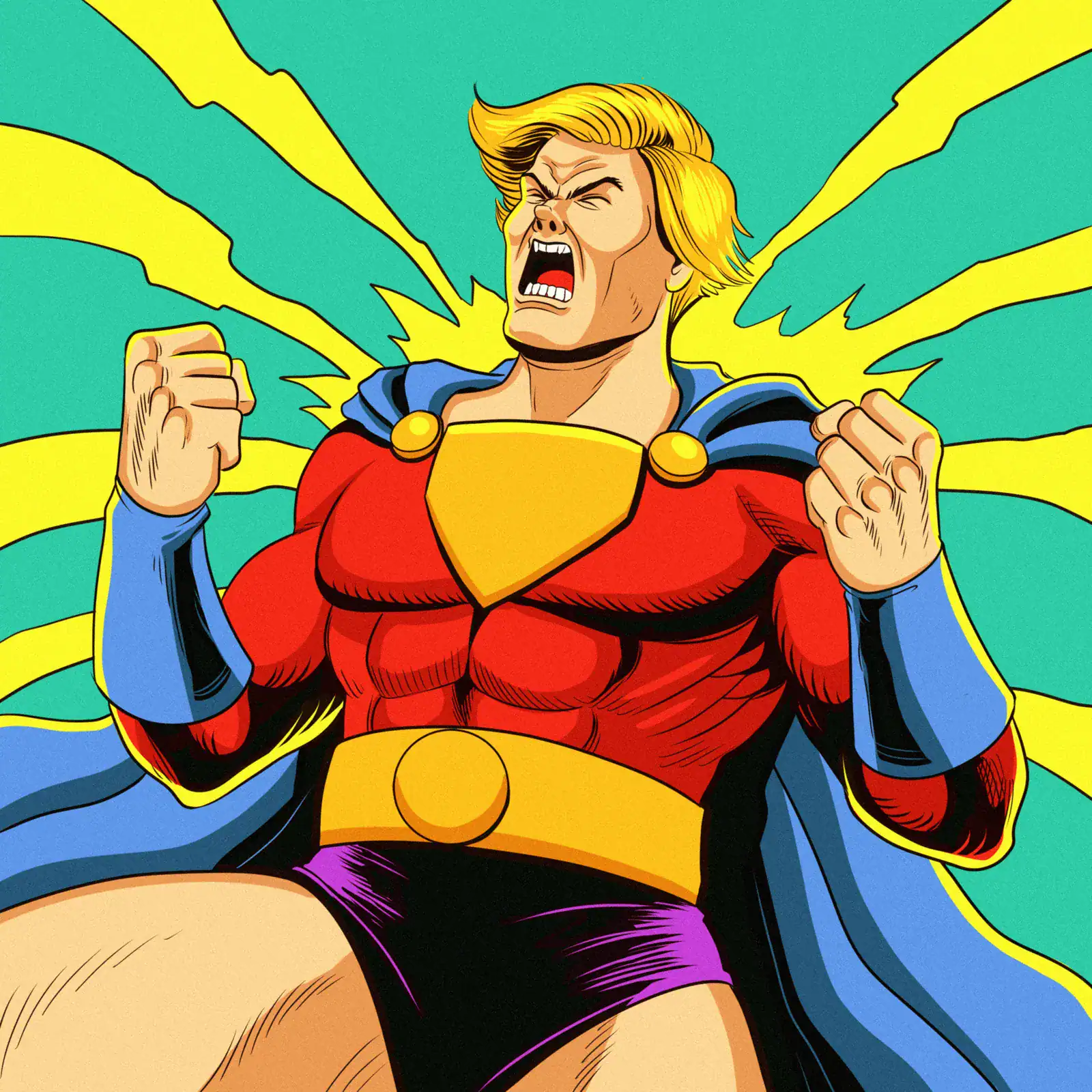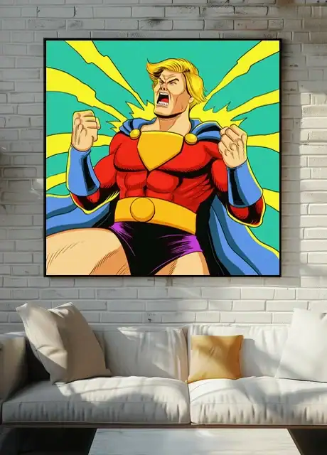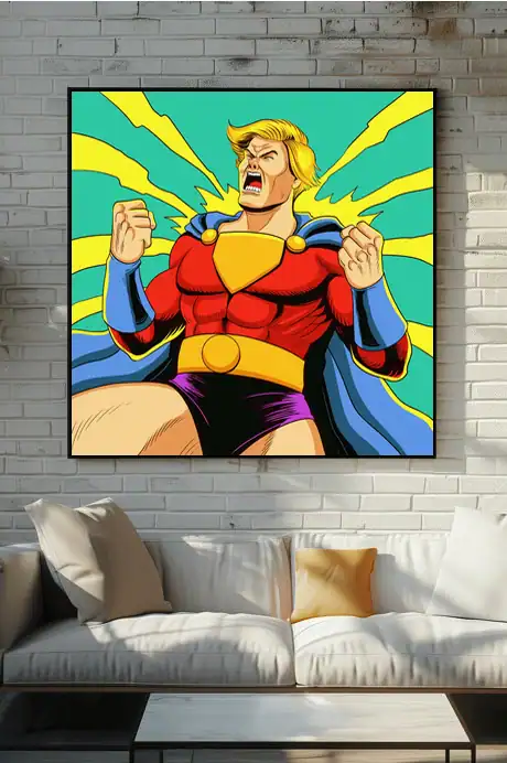 A muscular superhero screams with fists raised against radiating lightning. Fabricio Vainer’s the super hero 2 art trading card canvas print captures classic comic intensity. The turquoise background particularly amplifies the character’s aggressive golden-haired stance.