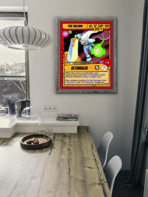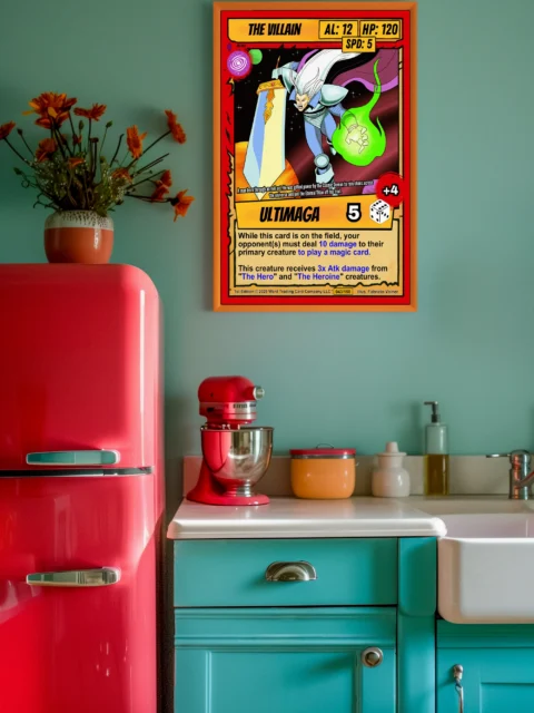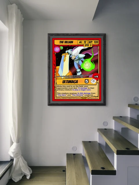 Bold outlines and cel-shaded coloring make this artwork readable from across a room. Collectors looking for villain archetypes recognize the stat distribution and high-cost energy marker. The the villain trading card canvas print works for anyone building a rogues gallery.