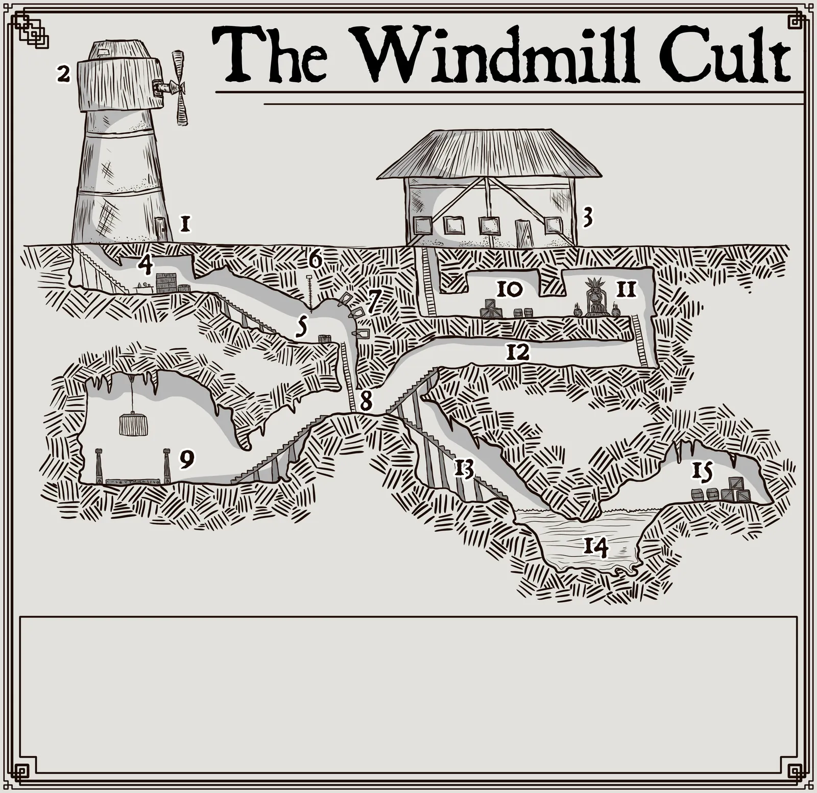 A windmill anchors the surface while numbered chambers spiral beneath carved stone. The Windmill Cult No Labels fantasy battle map canvas print renders fifteen connected rooms in stark black ink. Decorative corner flourishes frame the entire dungeon complex in classic cartographic style.
