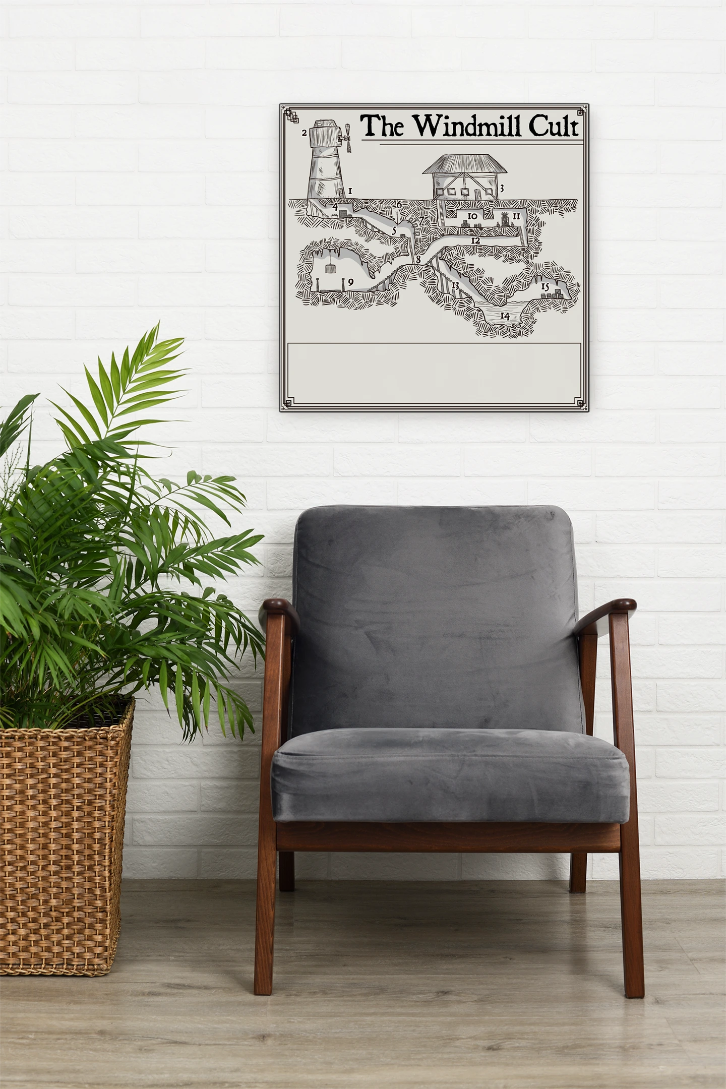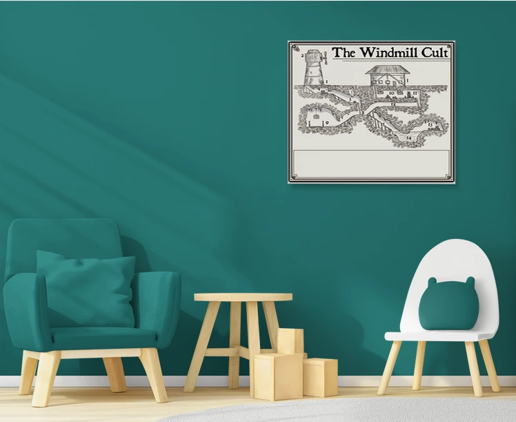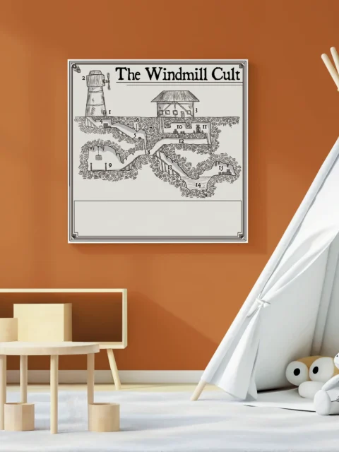 The unlabeled room numbers let dungeon masters overlay their own encounter design session after session. This speaks directly to DMs who prep adventures using modular dungeon layouts for D&D campaigns. The Windmill Cult No Labels fantasy battle map canvas print particularly serves tables running Shadowdark or OSR systems.