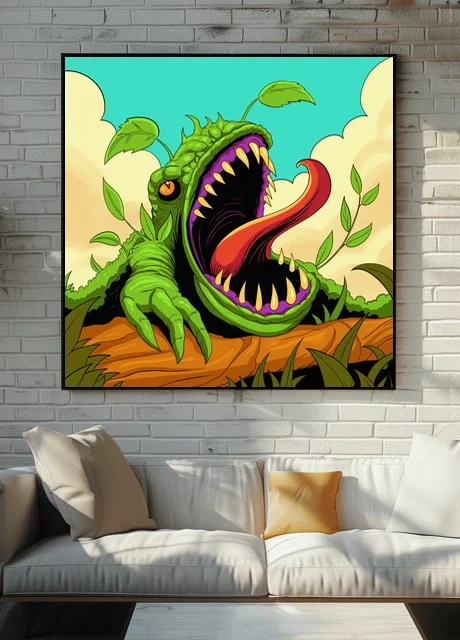 A monstrous Venus flytrap creature erupts from brown soil with jaws wide. This thresher art trading card art canvas print captures Fabricio Vainer’s bold comic book illustration at full scale. Notably, the single orange eye and purple gums create unsettling biological detail.