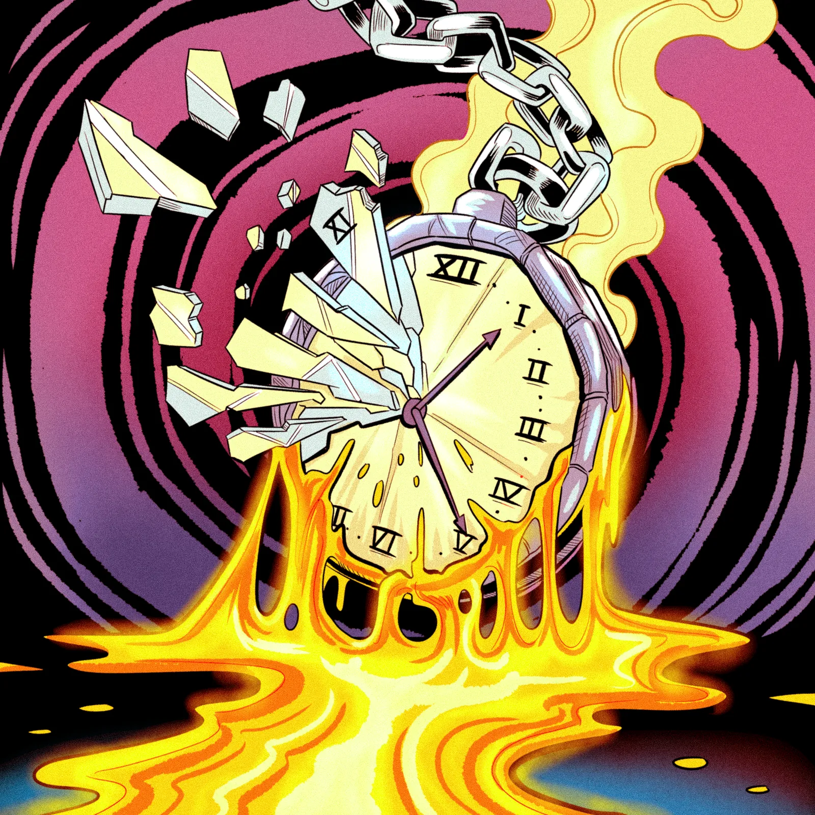 Additionally, the magenta and purple spiral rings create hypnotic depth behind the disintegrating timepiece. Yellow-orange flames rise through the composition, contrasting sharply against the black outlines and flat color fills. Moreover, the silver chain extends from the crown into the upper corner, anchoring the chaos.