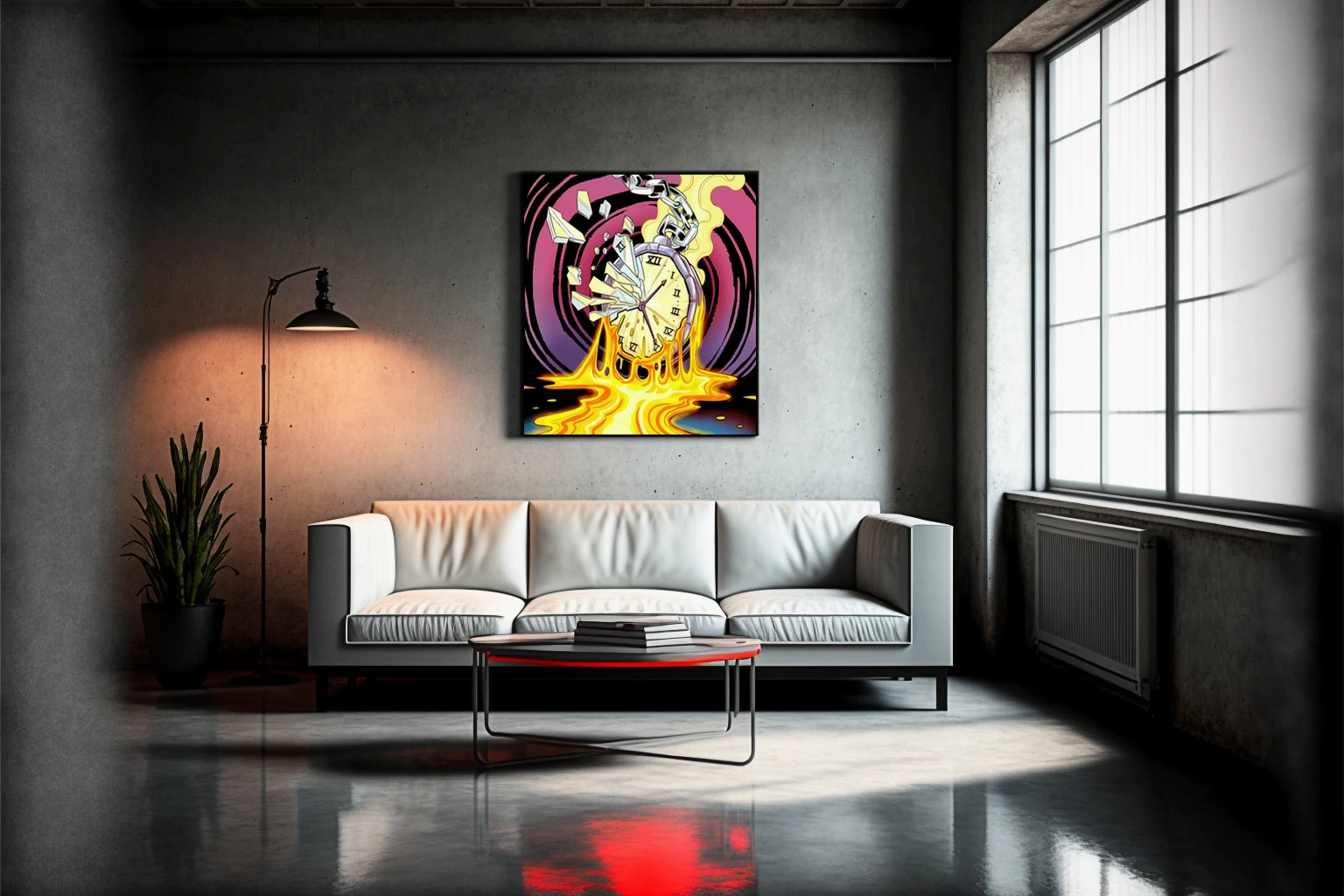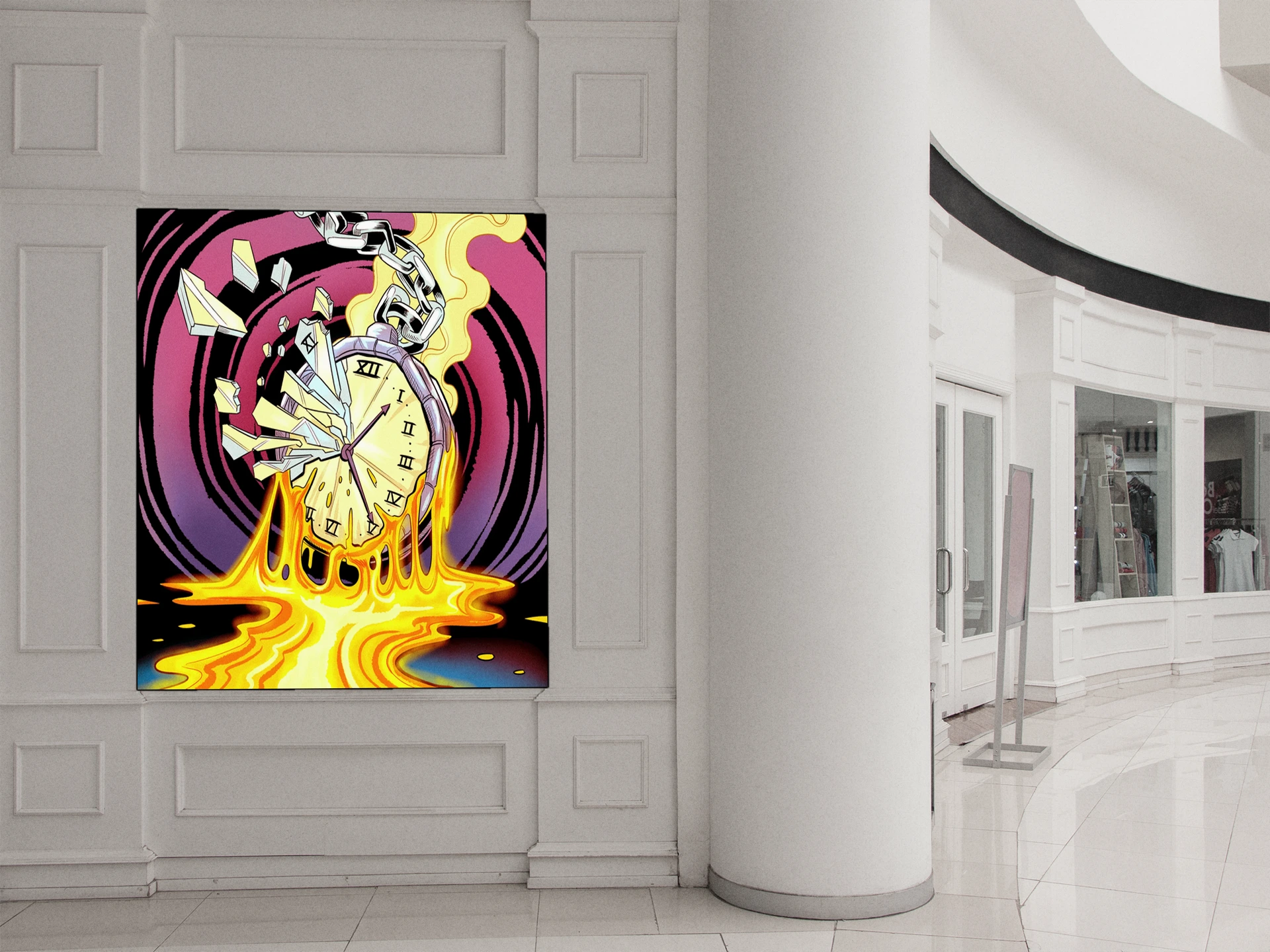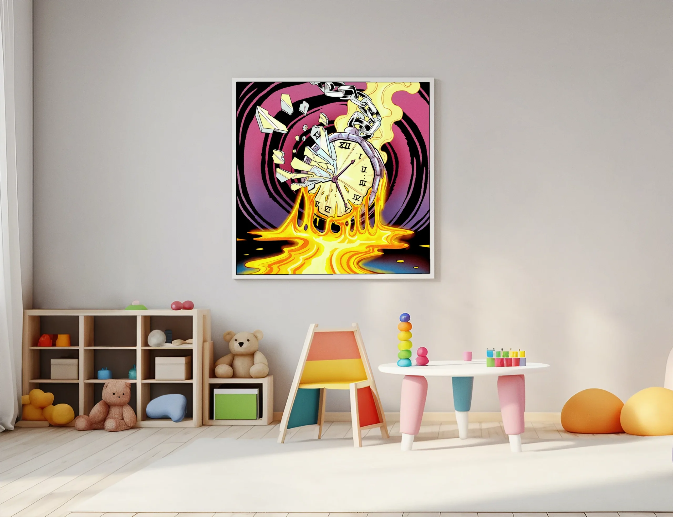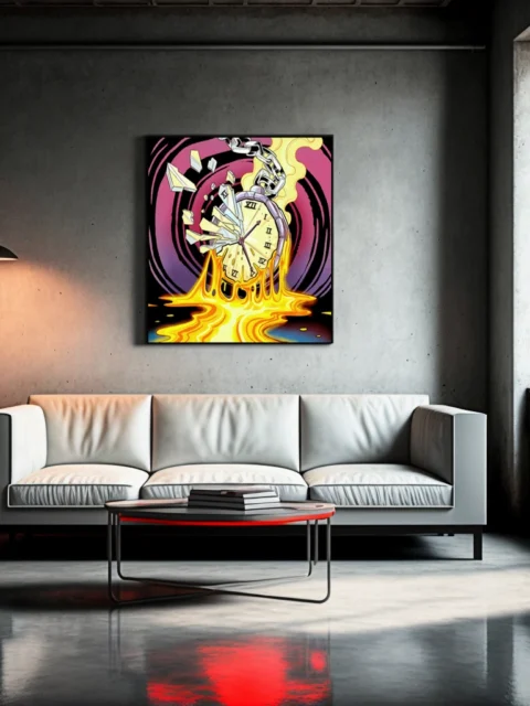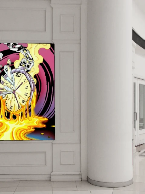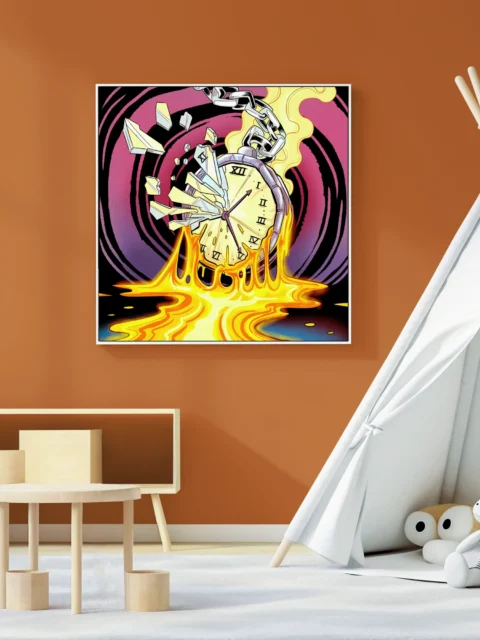 The chaotic energy suits game rooms where bold color and surreal imagery amplify competitive atmosphere. Additionally, creative studios benefit from the piece’s commentary on time and destruction rendered in comic style.