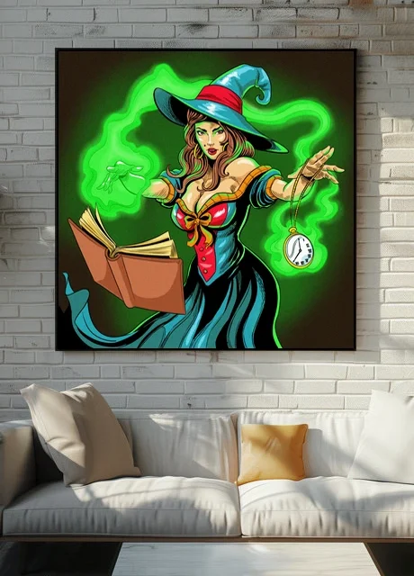 A green-skinned witch balances an open spellbook and dangling pocket watch. This time witch art trading card art canvas print captures Fabricio Vainer’s bold cel-shaded illustration. The swirling green magical mist frames her figure, notably creating an organic border effect.