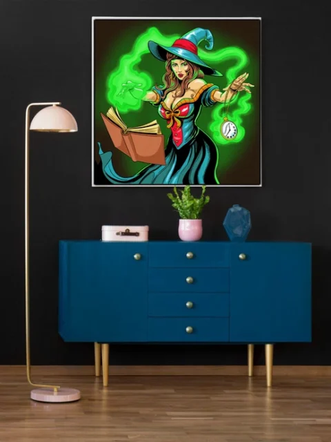 On the wall, the comic book linework maintains crisp clarity at display scale. Ward TCG collectors and pin-up fantasy art enthusiasts both find appeal in Vainer’s character work. This time witch art trading card art canvas print delivers gallery-ready illustration without card borders.