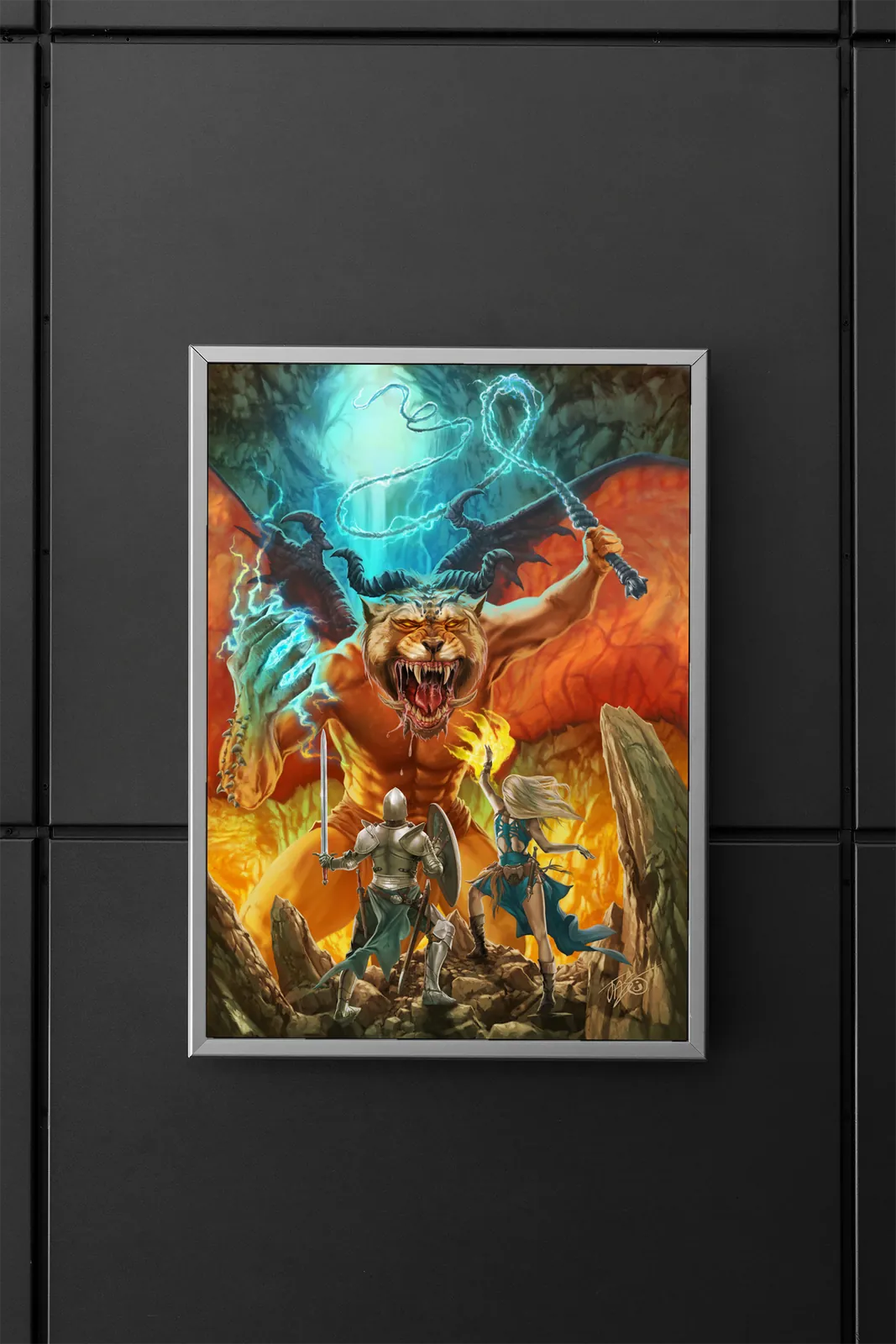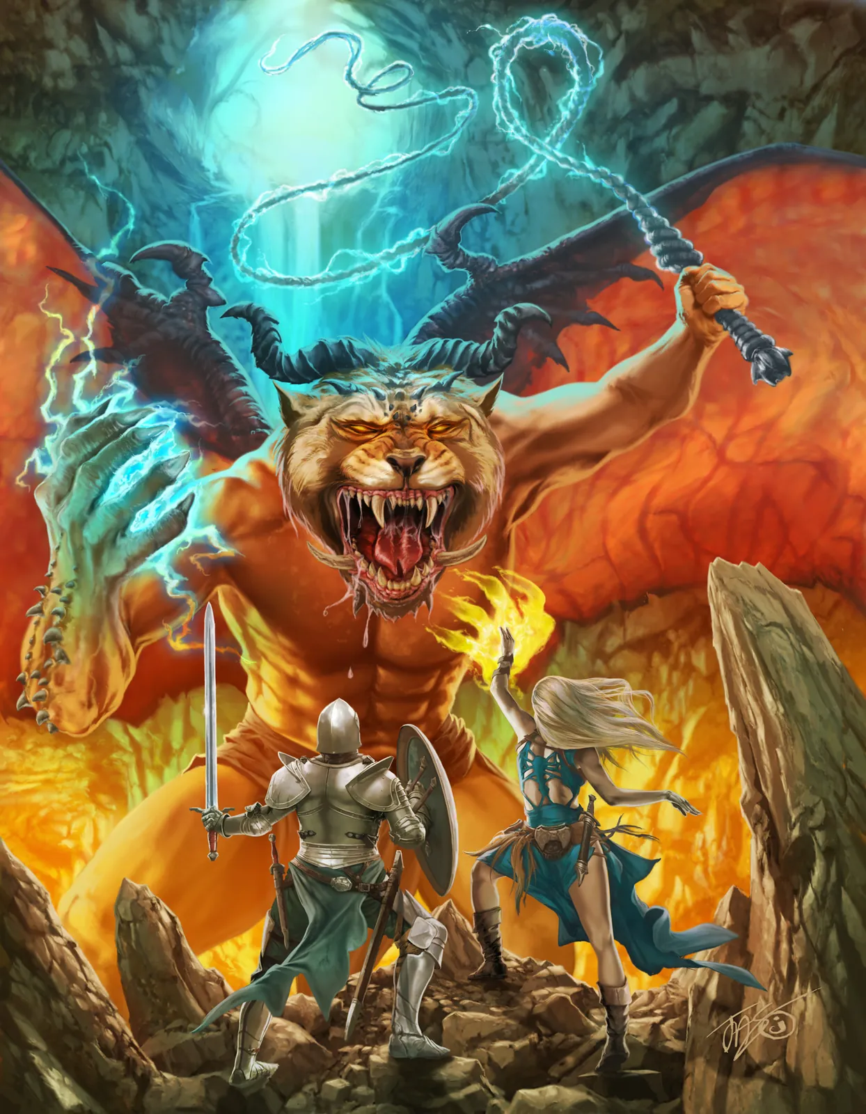 Moreover, a massive horned demon towers over the battlefield, wings spread amid fire and crackling lightning. Meanwhile, two adventurers stand defiant, steel and magic raised against annihilation. Consequently, the contrast between mortal figures and monstrous force amplifies tension. In addition, the clash of blue lightning and infernal flame drives the eye upward through the composition.