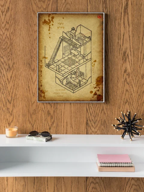 This map holds three encounter zones in one frame. Dungeon masters running urban intrigue or infiltration missions reference the layout mid-session. The trapped house no labels fantasy battle map canvas print particularly suits DMs who build modular dungeons.