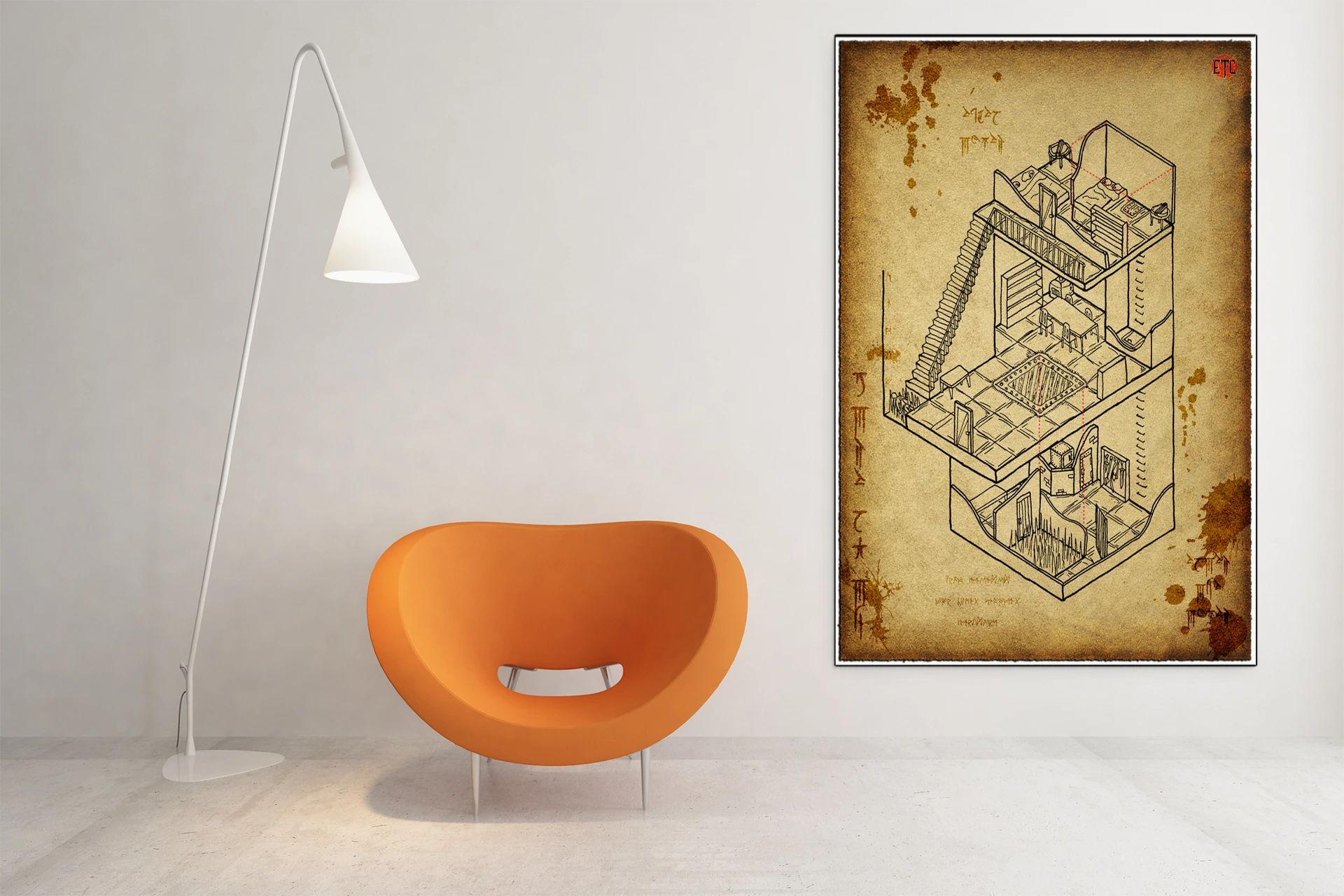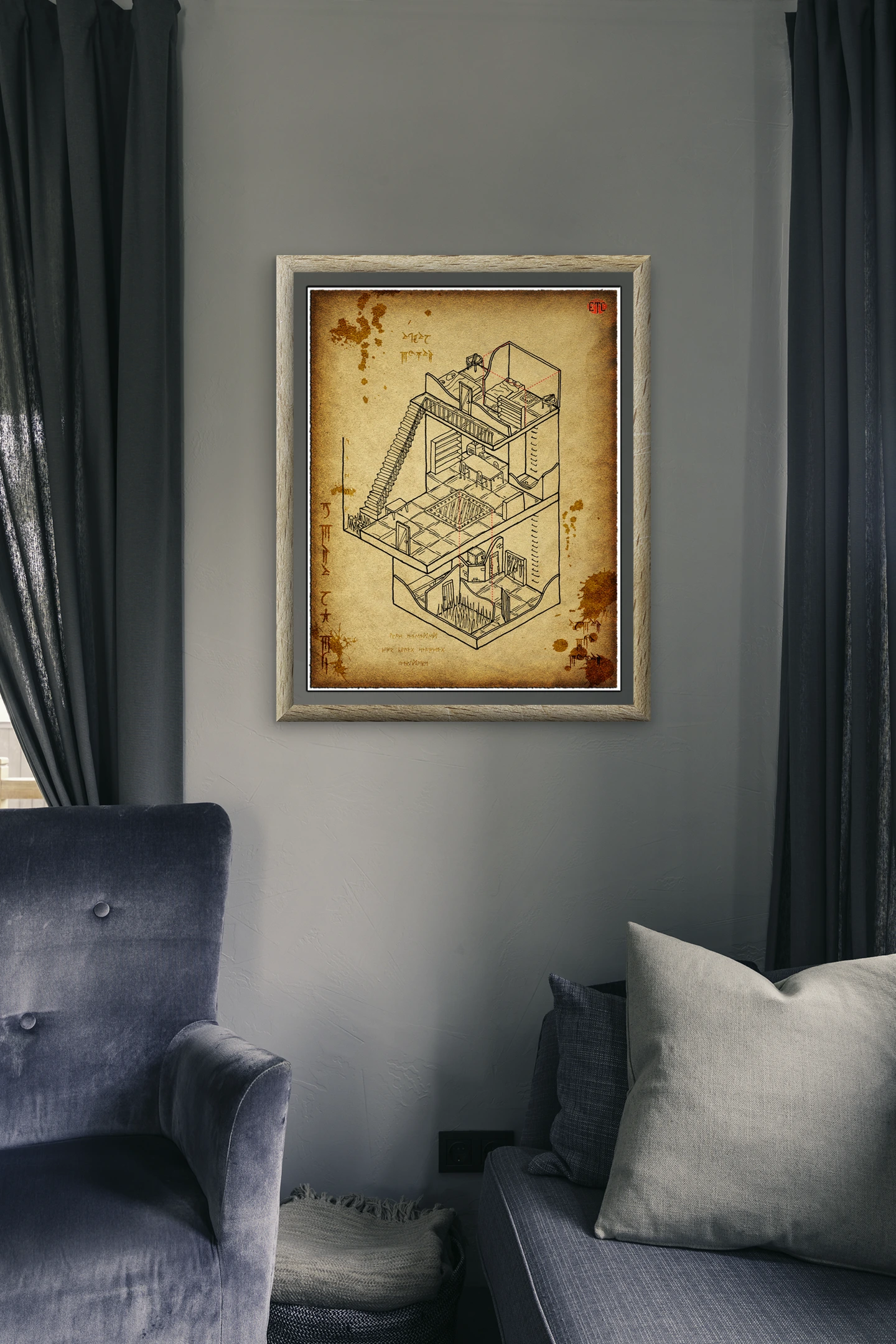 An isometric cutaway reveals three dungeon levels carved into stone. This trapped house no labels fantasy battle map canvas print shows prison cells, spike pits. And torture devices in clean ink. Notably, aged parchment texture and brown water stains frame the architectural drawing.