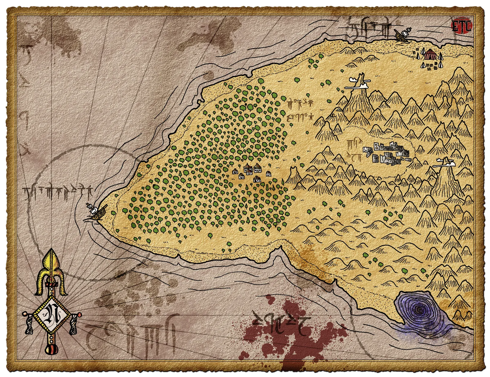 Notably, coniferous symbols scatter across the right side while a fortress crowns the northern coastline. The left terrain features tightly packed green trees against barren stone. A mysterious blue spiral marks the southeastern edge near the water.