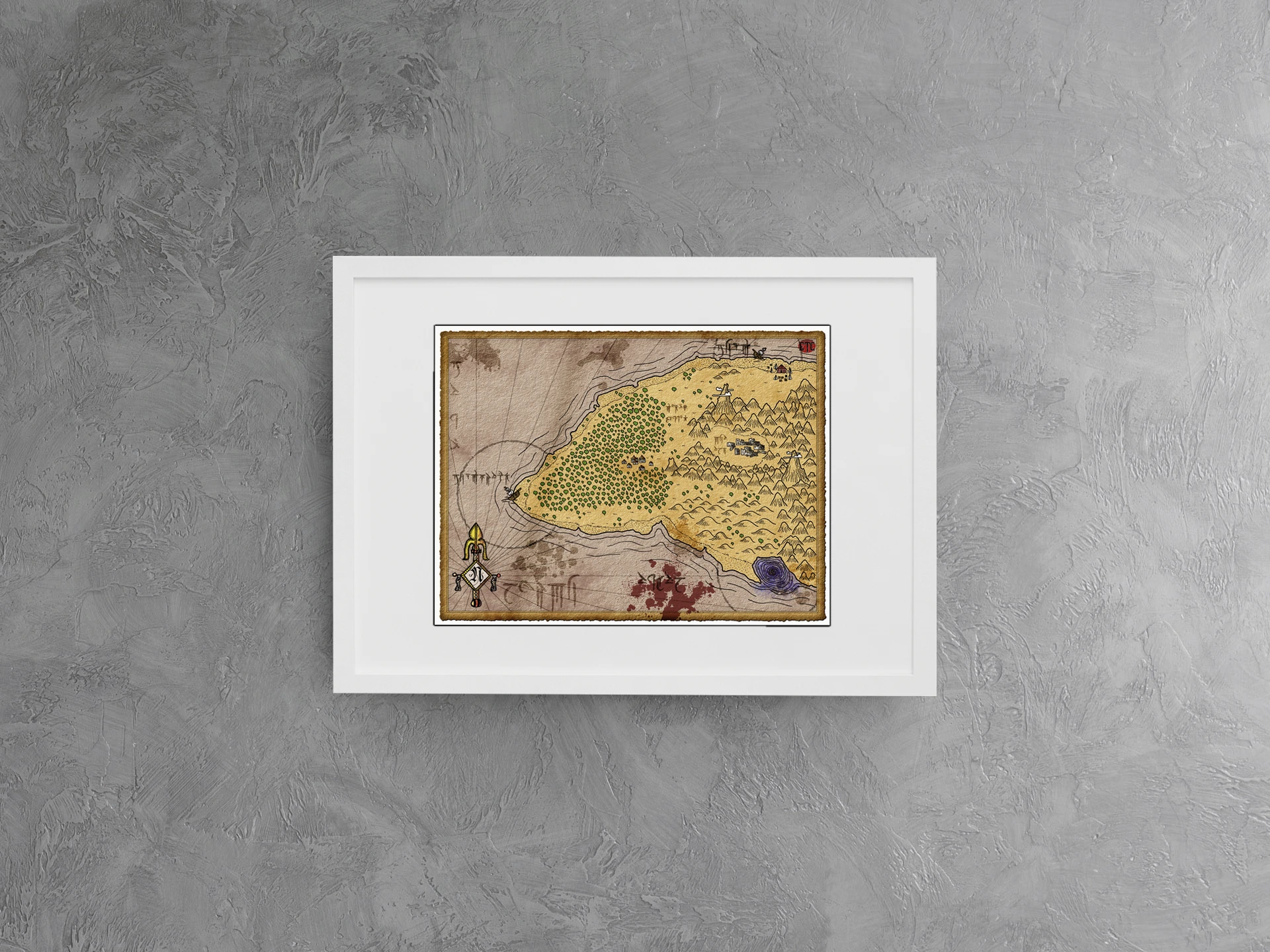 A weathered parchment map shows a coastal region split between rocky gray cliffs and golden sandy terrain. This treasure island no labels fantasy battle map canvas print depicts a settlement nestled among dense deciduous forests. Dark red-brown stains mark the aged surface, particularly around the compass rose.