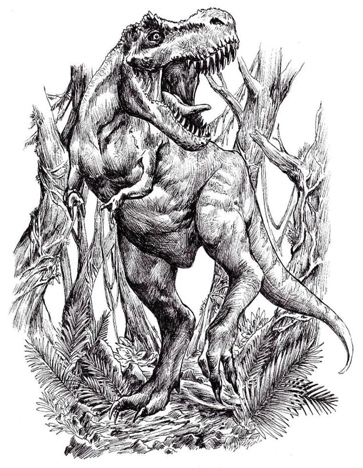 TRex erupts from dense prehistoric growth with jaws stretched wide in a display of raw dominance. Moreover, the scene conveys immediate mortal threat as the creature’s posture and open maw signal an apex predator asserting control. Consequently, the encounter feels sudden and unavoidable.