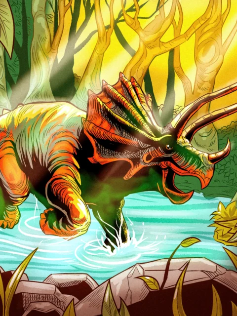 A Styracosaurus wades through turquoise shallows in a prehistoric forest. This trike art trading card art canvas print showcases Fabricio Vainer’s cel-shaded digital illustration. The dinosaur’s orange and red plating contrasts notably with the teal water.