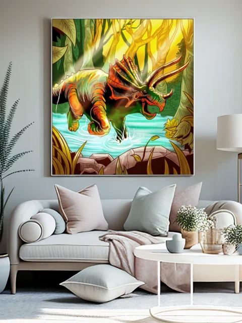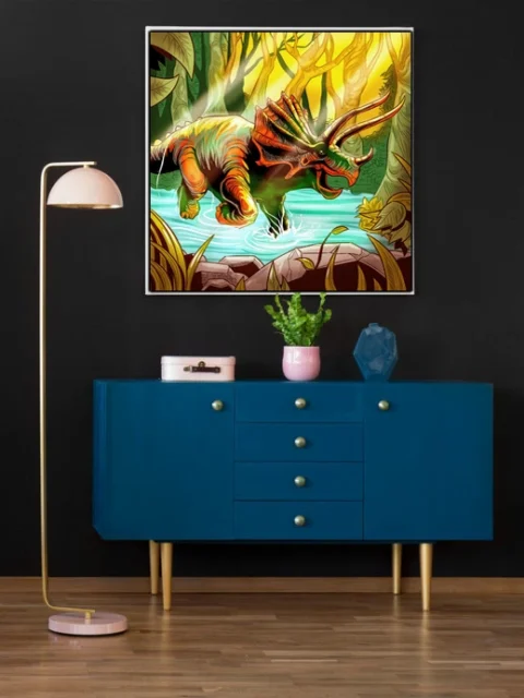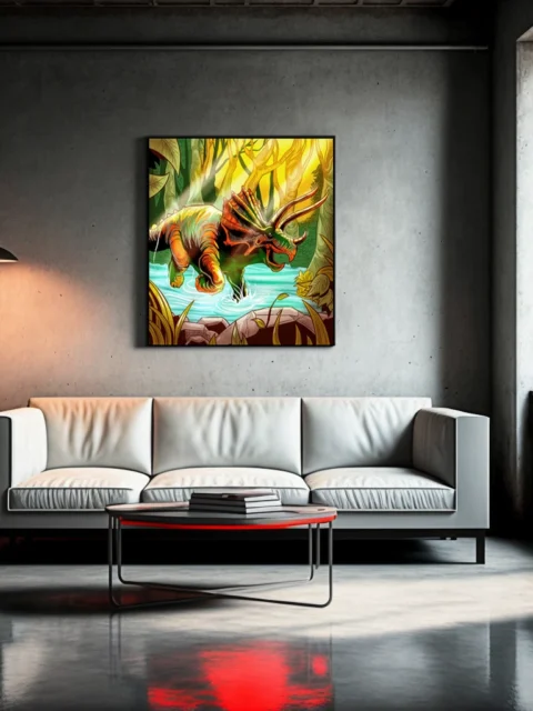 The vibrant prehistoric scene suits a game room where bold colors and creature-focused artwork set the tone. Additionally, the comic book aesthetic pairs well with graphic novel collections or TCG display walls.