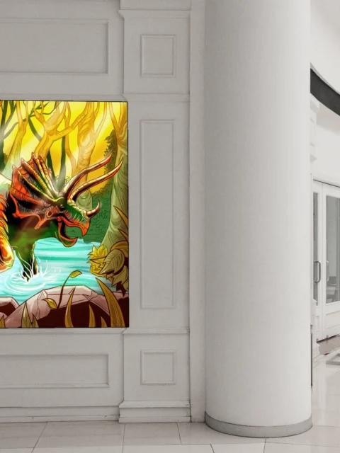 The vibrant prehistoric scene suits a game room where bold colors and creature-focused artwork set the tone. Additionally, the comic book aesthetic pairs well with graphic novel collections or TCG display walls.