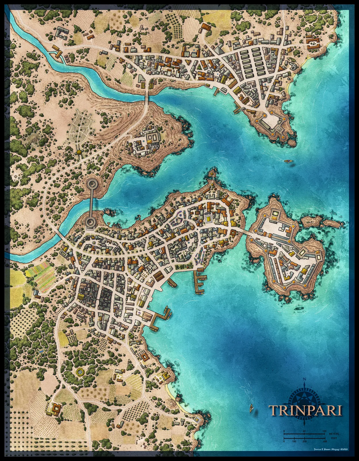 Finally, natural terrain transitions frame the urban core and emphasize scale. Above all, the layout communicates trade, defense, and movement at a glance. Consequently, Trinpari feels alive, functional, and story-ready.