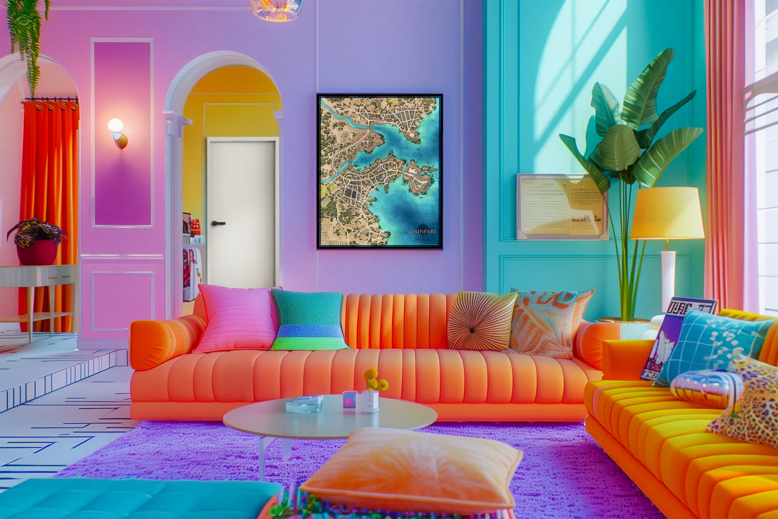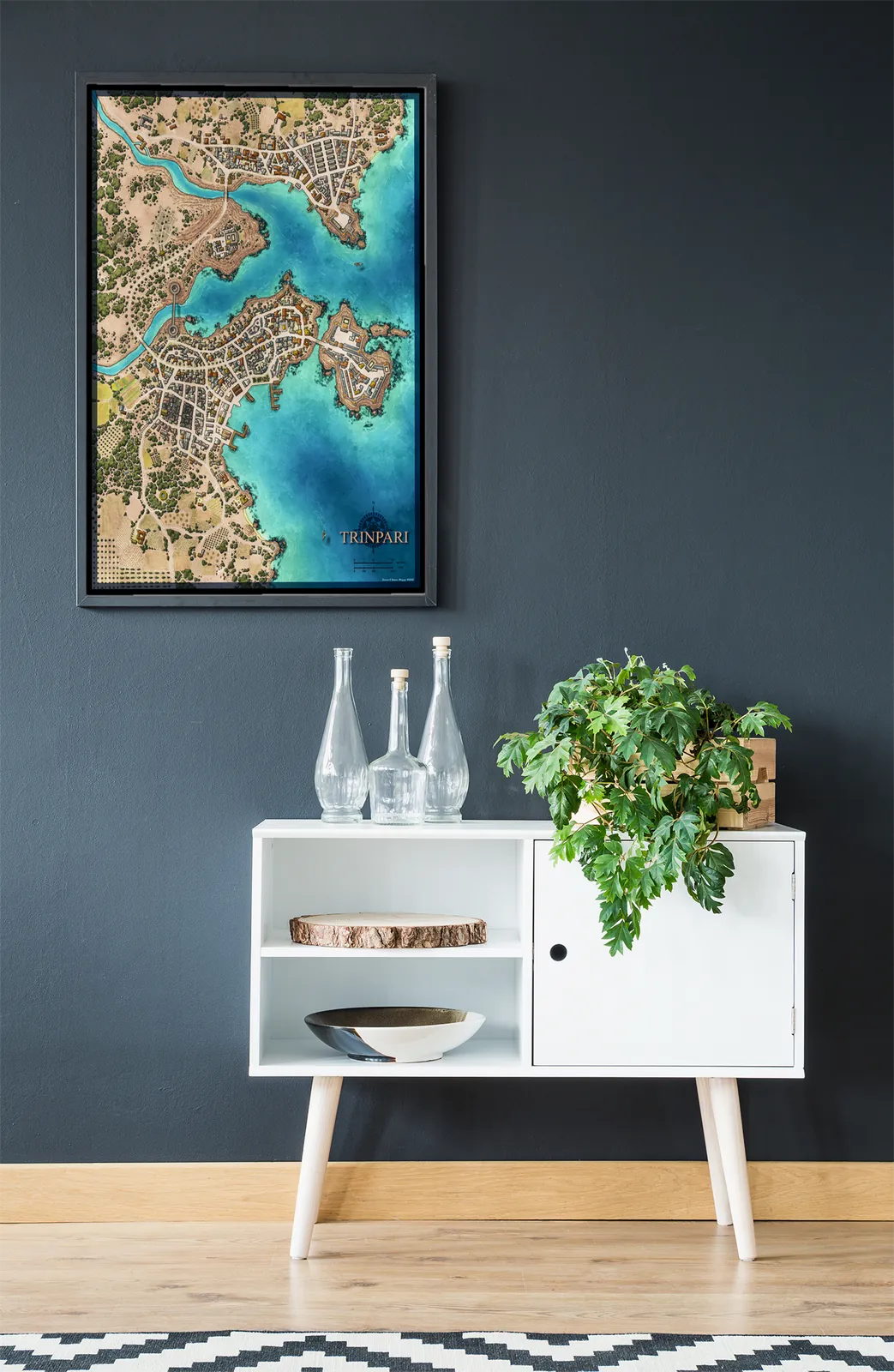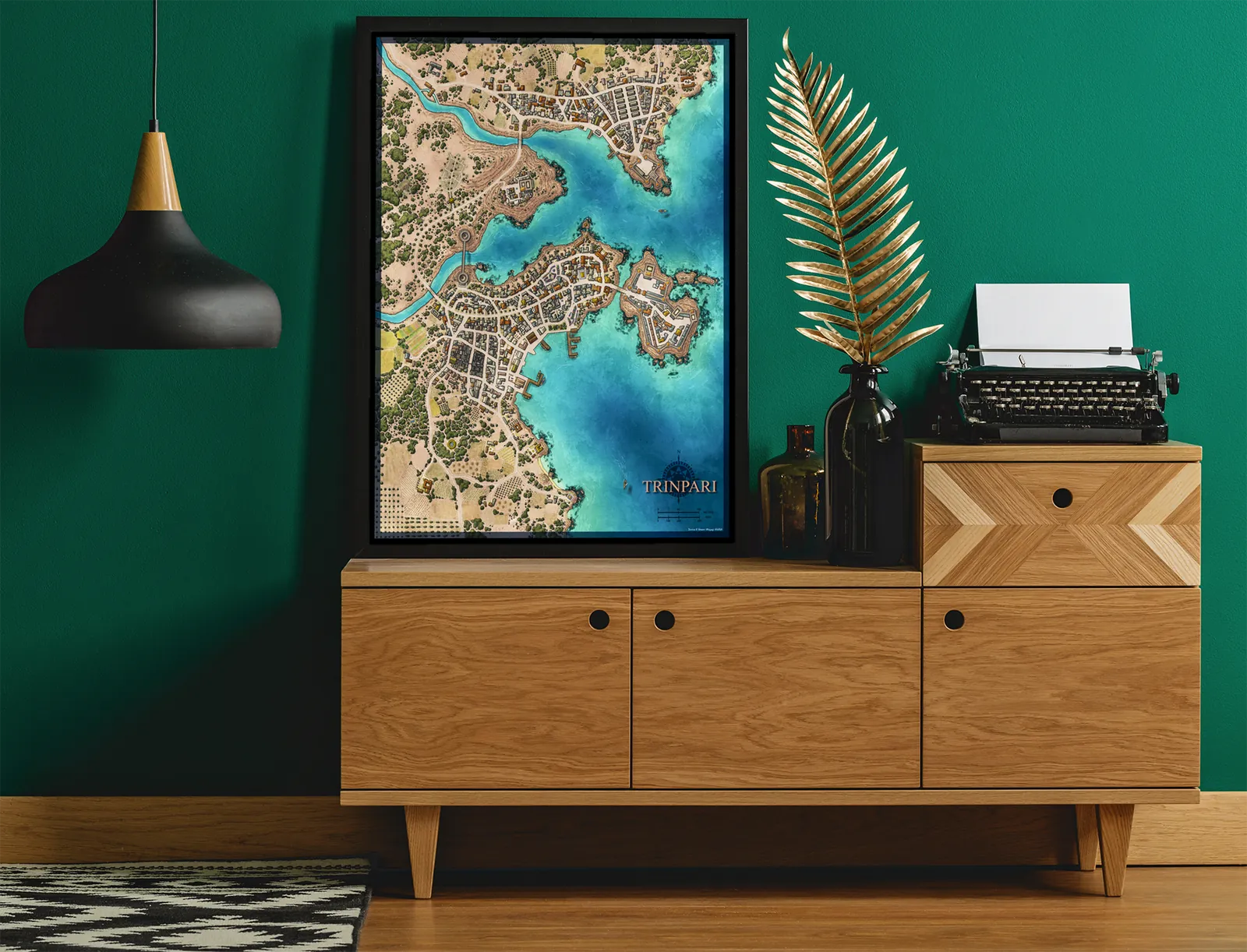 Trinpari Harbor City Map Wall Art Canvas illustrates a coastal settlement shaped by coves, docks, and layered neighborhoods. Moreover, the Trinpari harbor city map clearly shows how waterways, roads, and districts interlock around a protected bay. Consequently, the city reads as navigable, intentional, and well suited for play or display.