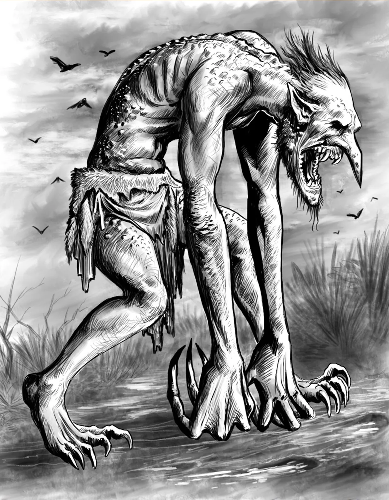 Troll lurches forward from a barren marsh with elongated limbs and a jaw stretched in feral aggression. Moreover, the creature’s hunched posture signals an immediate and physical threat, as if it has already chosen its prey. Consequently, the scene feels unavoidable and brutally direct.