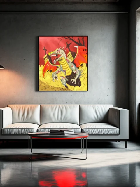The apocalyptic color scheme suits game rooms where creature art sets the tone for tabletop sessions. Additionally, the high-contrast style pairs well with minimalist walls that need a bold focal point.