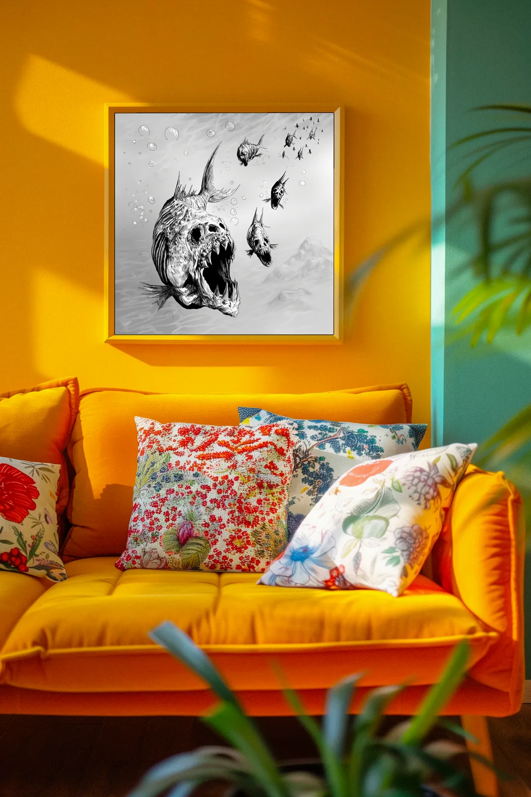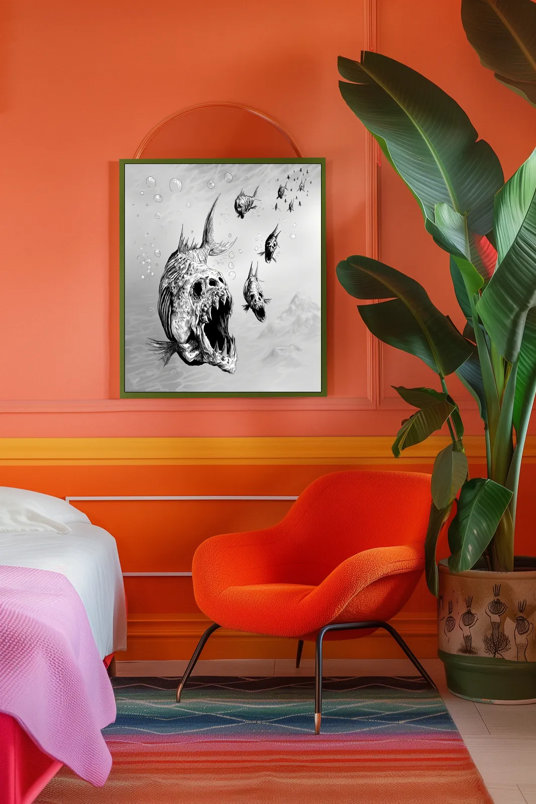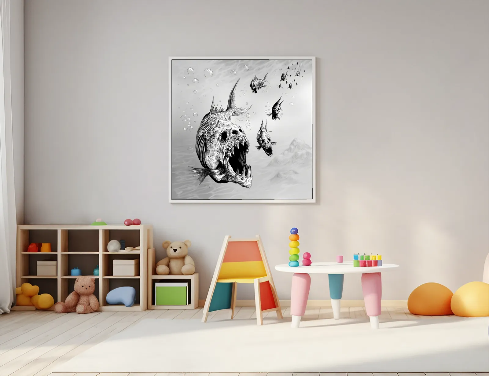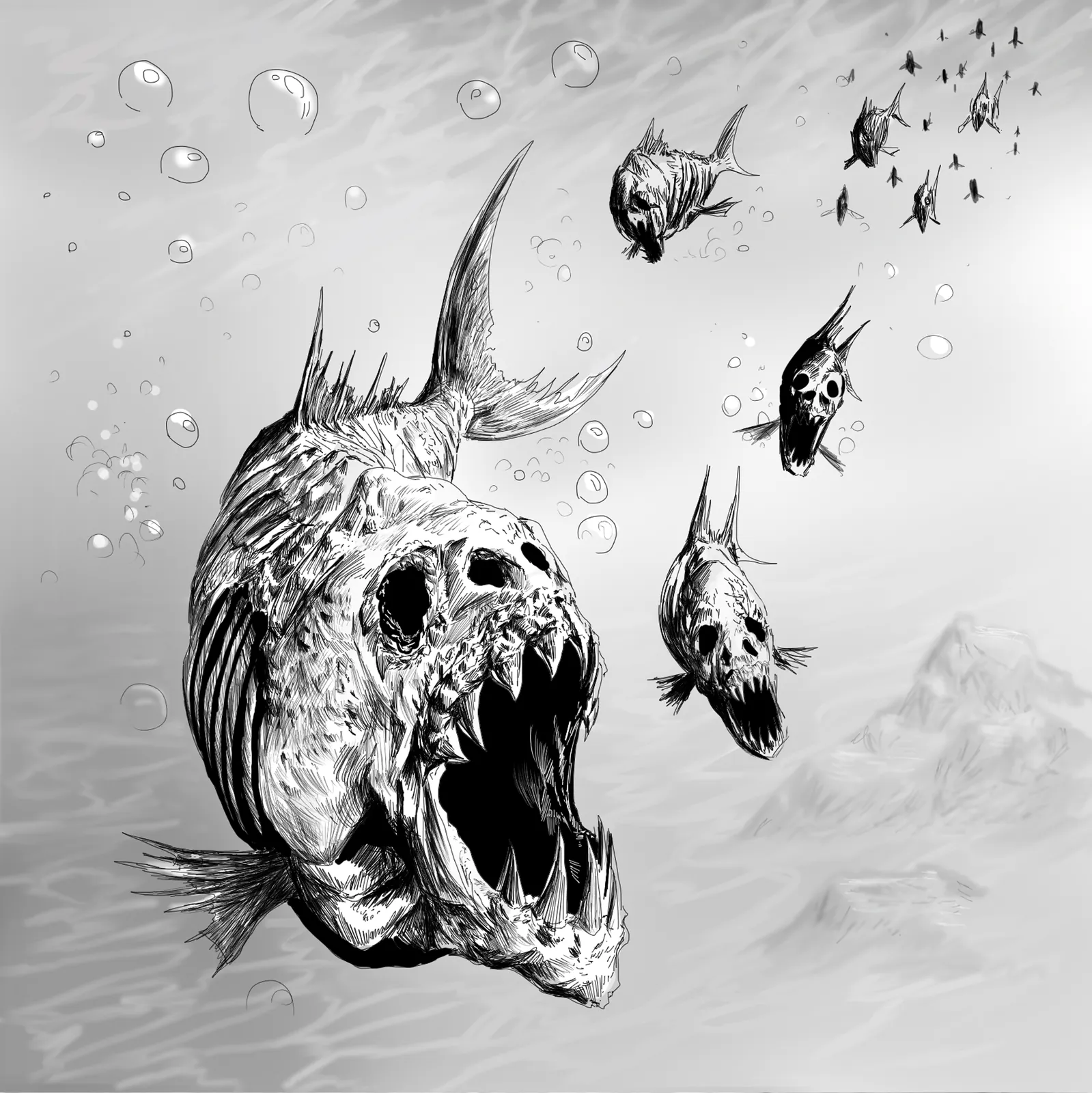 Finally, stark monochrome contrast heightens texture and menace. Moreover, harsh blacks carve the skeletal features against pale water tones. Consequently, the image leaves a chilling impression of relentless predation tied to Undead Pirahna fantasy canvas art.