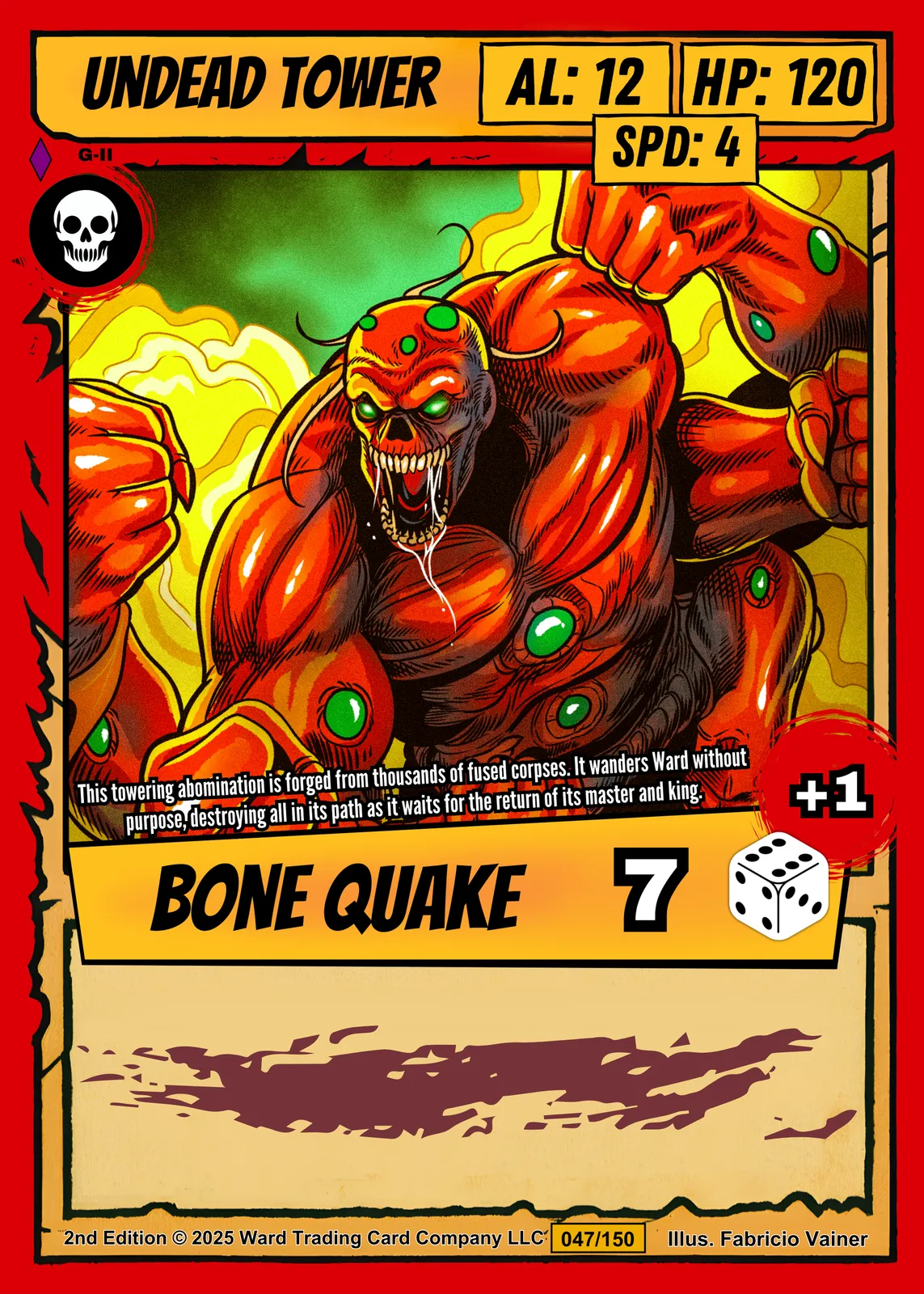 Additionally, the card design features a distressed red outer border with yellow-orange inner framing. A skull icon marks the top left corner. Stats read AL: 12, HP: 120, and SPD: 4 in yellow boxes beneath the header.
