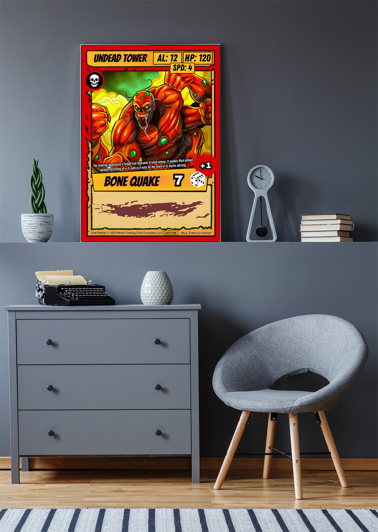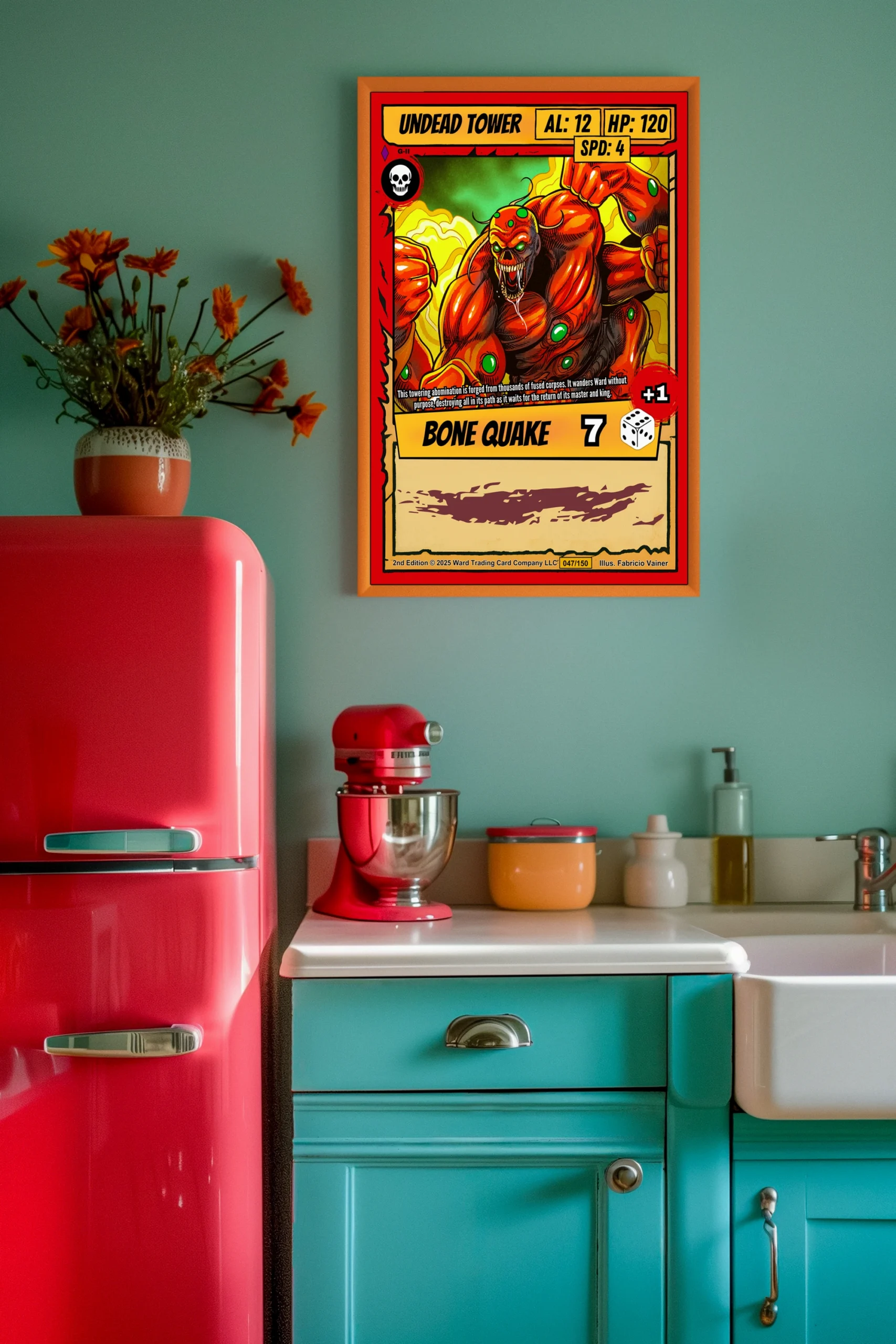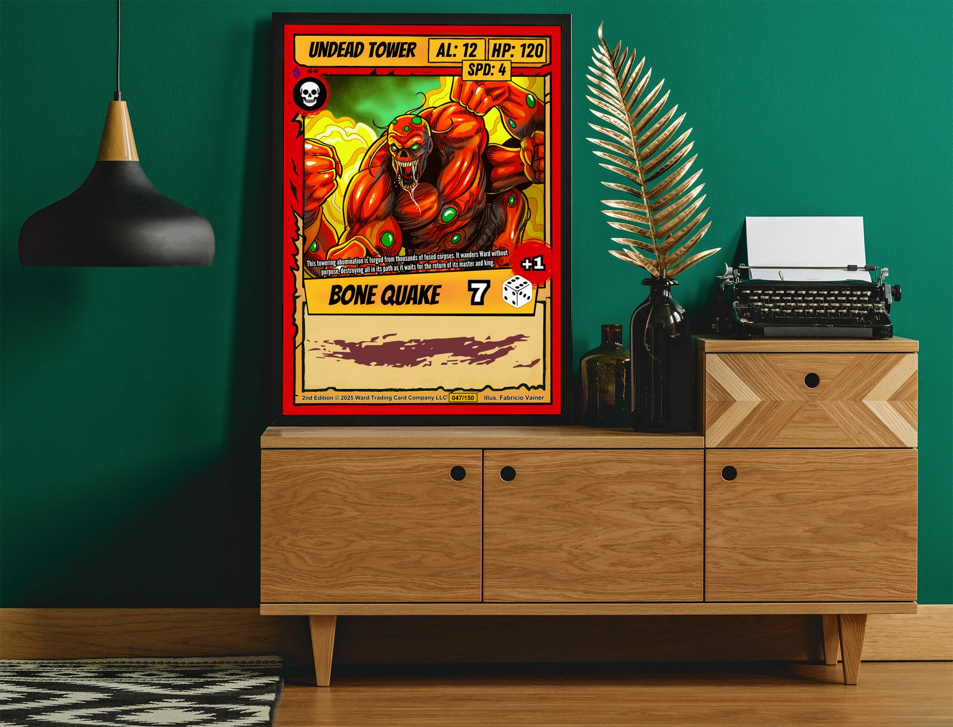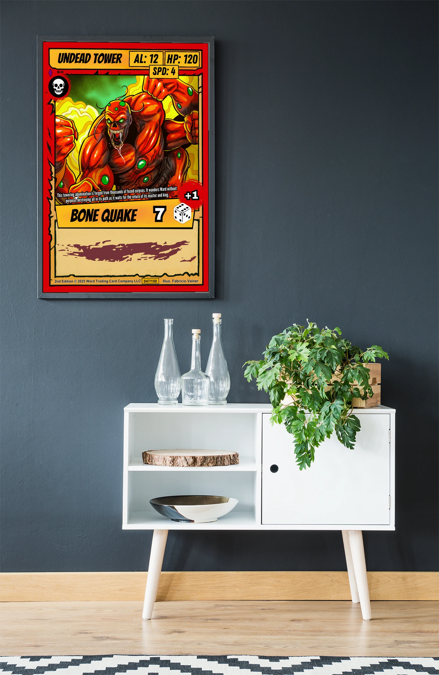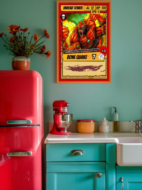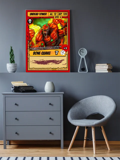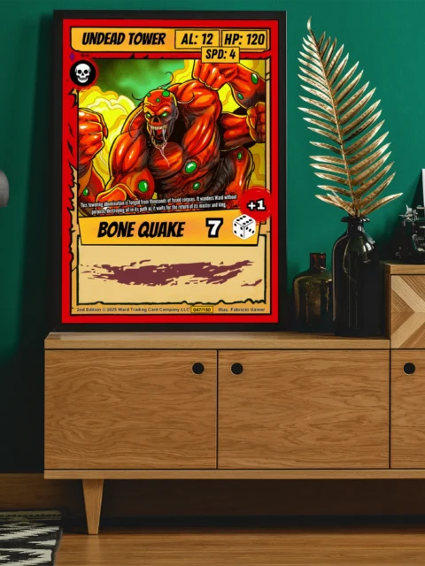 At room scale, the bold linework and high contrast colors read clearly across any space. Collectors of horror fantasy trading card art will recognize the visceral intensity immediately. This undead tower trading card canvas print captures the aggressive energy of Ward TCG’s creature design.