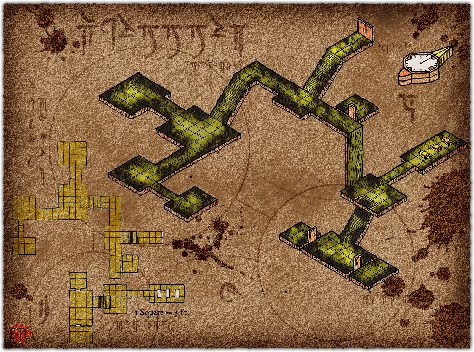 Additionally, dark brown stains and tears weather the parchment edges. A flat grid reference in golden yellow sits beside the compass rose. The scale indicator reads ‘1 Square = 5 ft.’ beneath partially visible script.