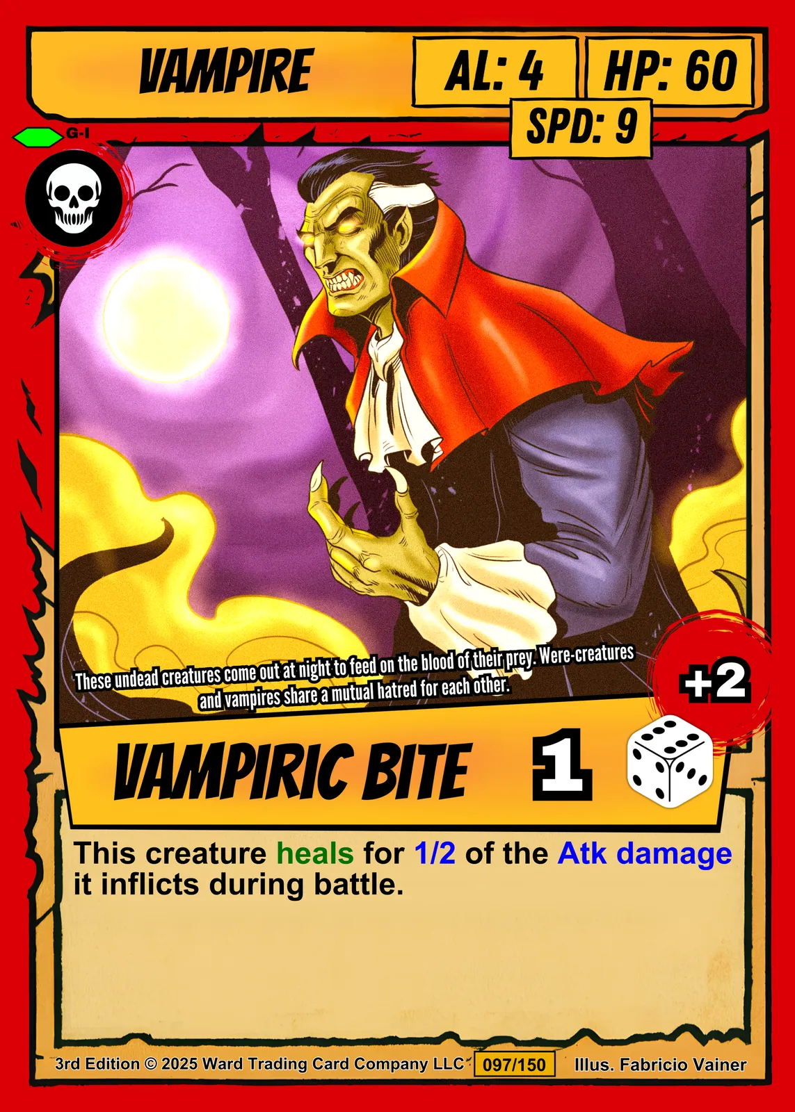 Additionally, the bright red border encloses orange and yellow header boxes. The title ‘VAMPIRE’ appears in bold lettering at the top. Stats read AL: 4, HP: 60, and SPD: 9 in their respective boxes.