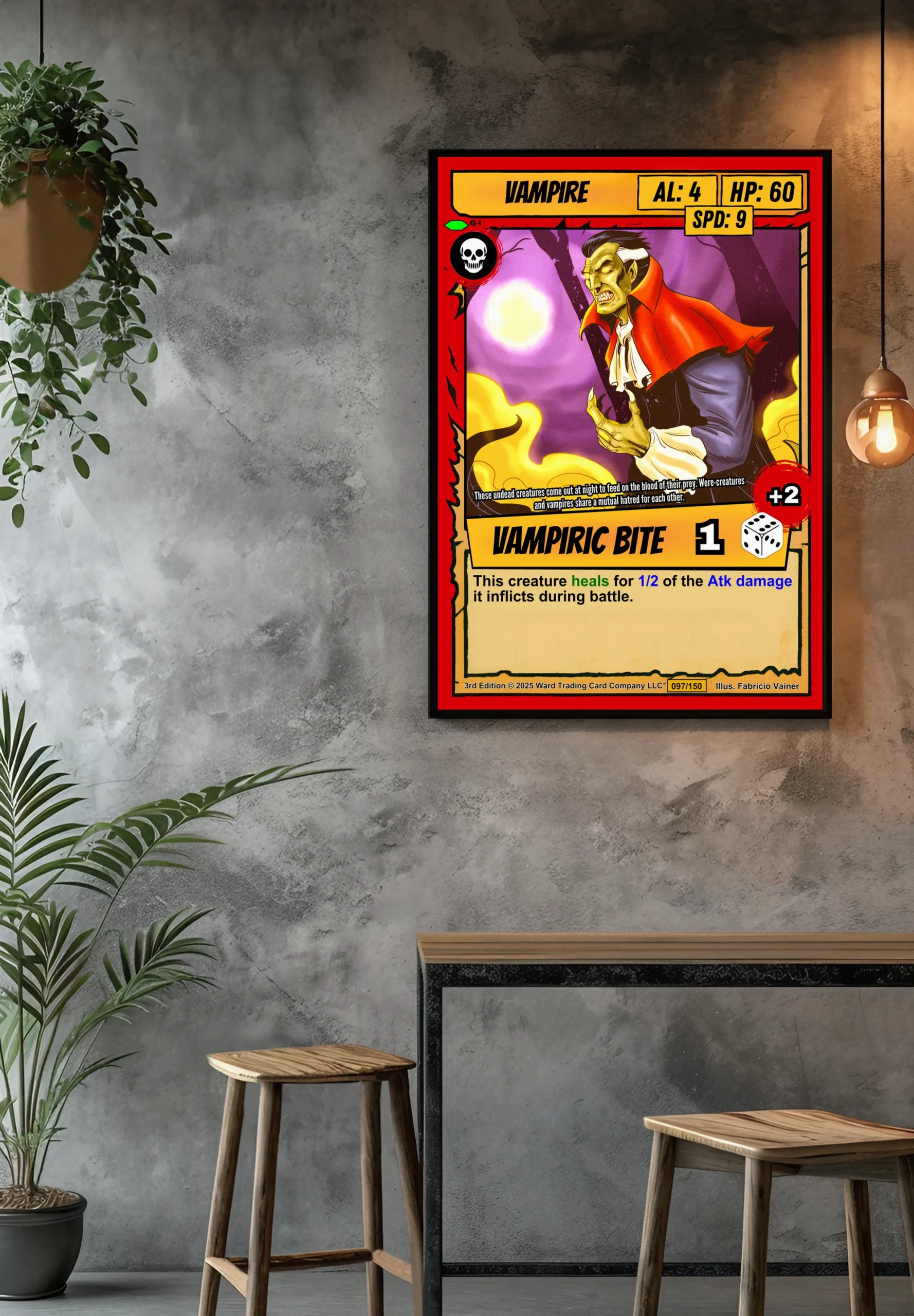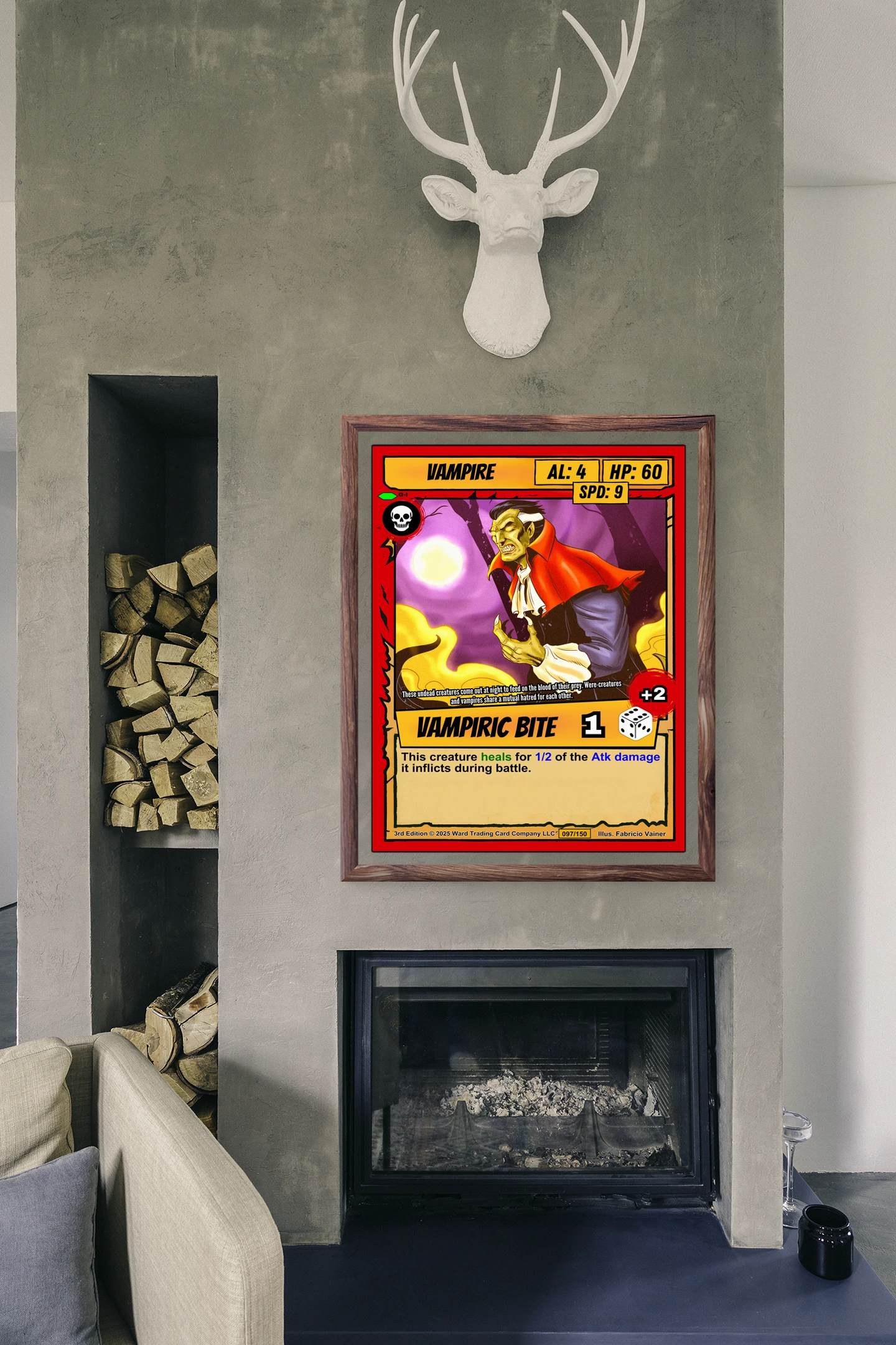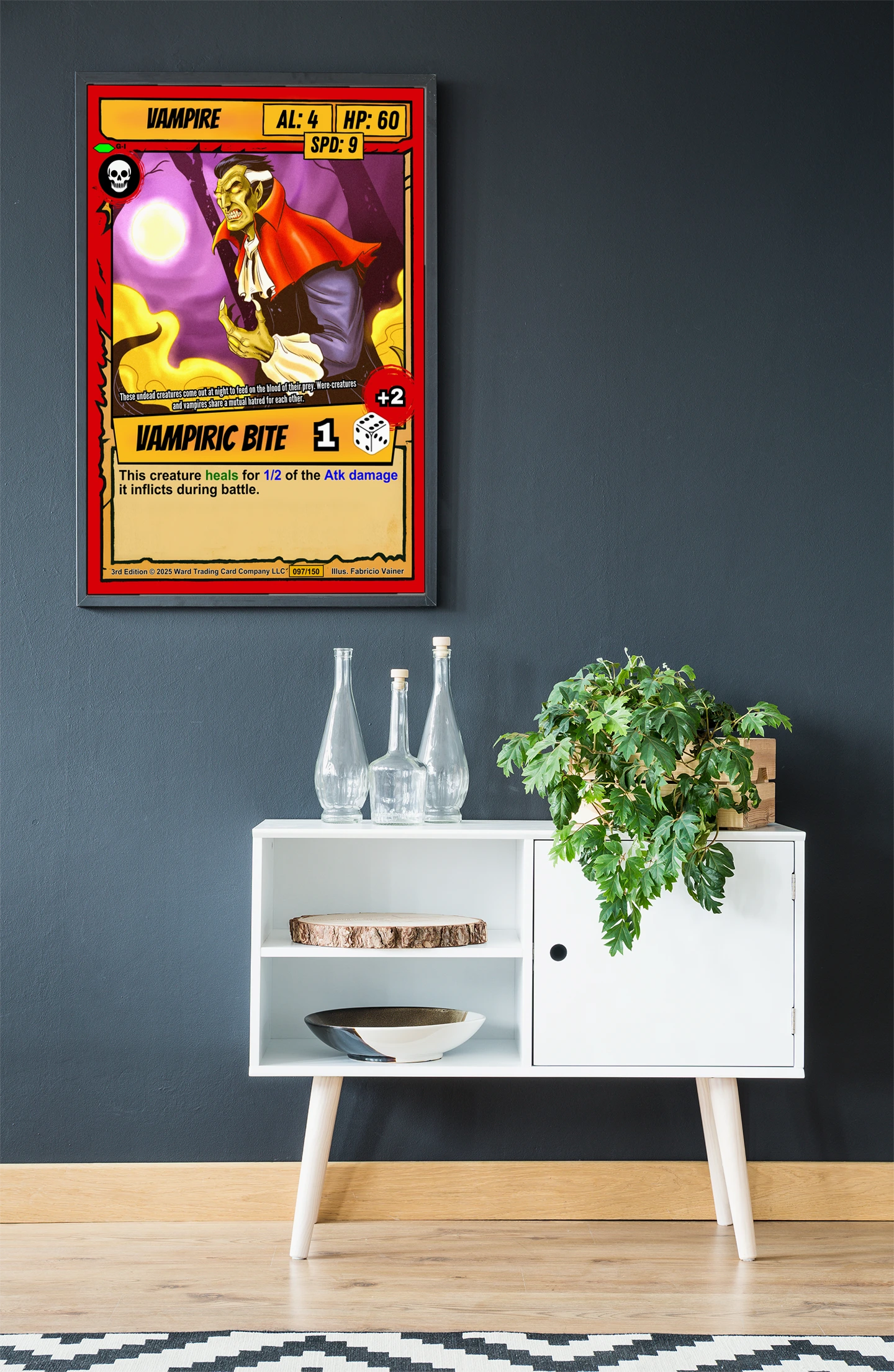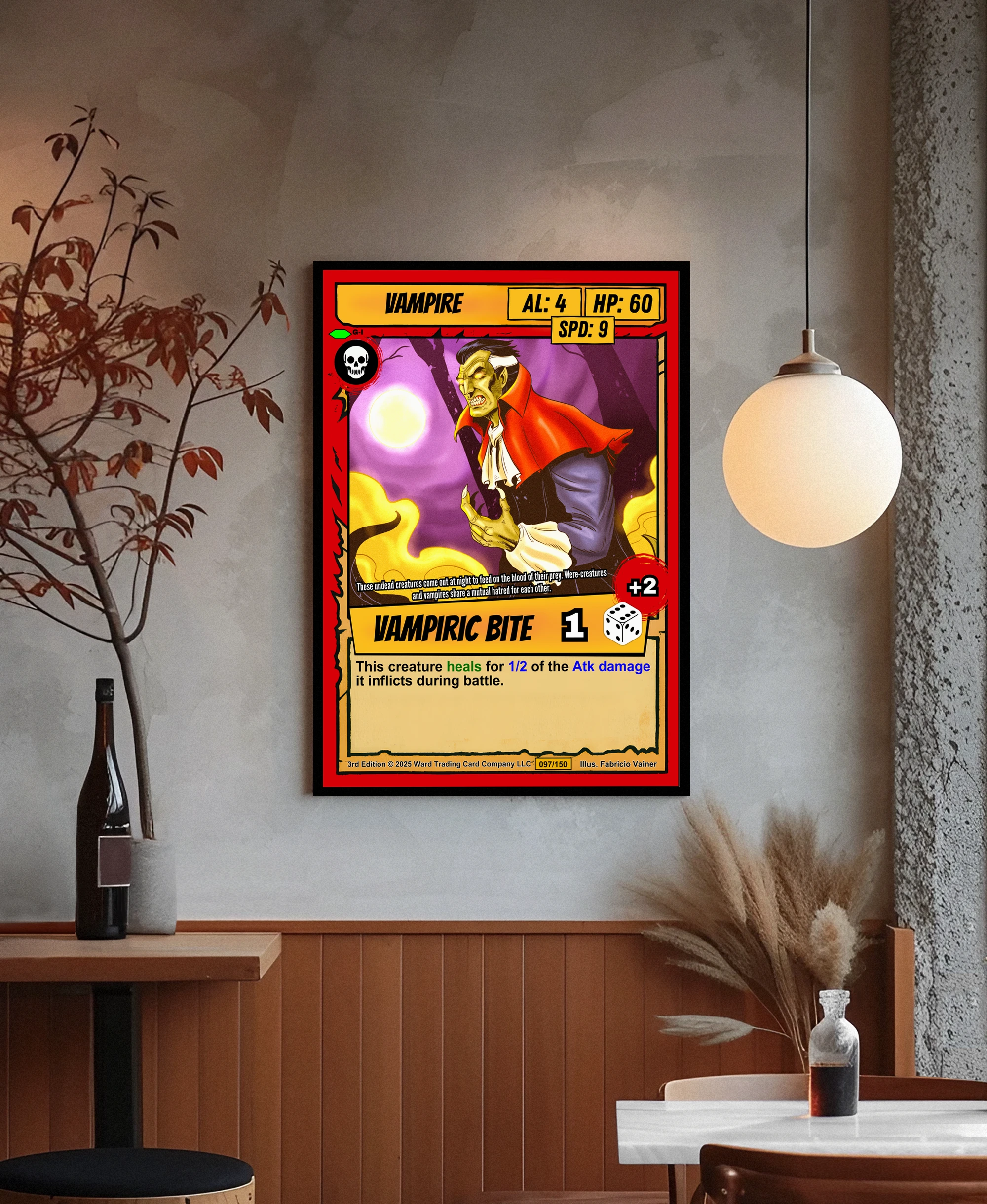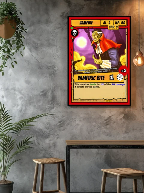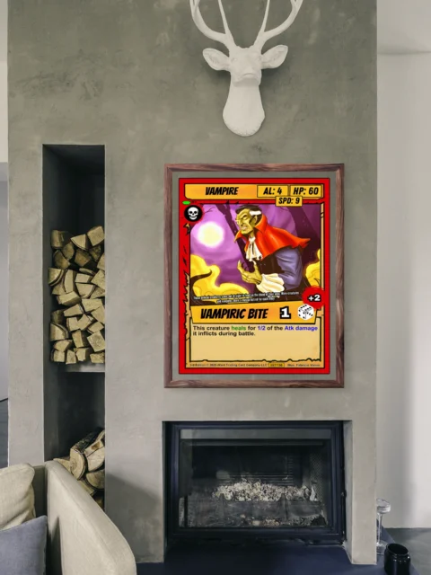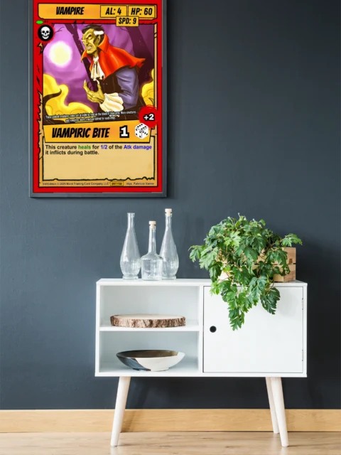 The comic book illustration style reads clearly across a room. Collectors seeking classic horror TCG artwork will recognize the campy gothic tone. This vampire trading card canvas print brings Ward’s iconic undead character to wall scale.