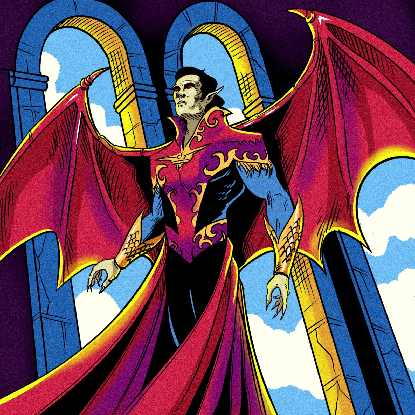 A winged vampire lord spreads bat wings before gothic arched windows. This vampire lord art trading card art canvas print captures Fabricio Vainer’s bold comic book illustration style. Notably, the crimson robe features ornate golden spiral and flame motifs.
