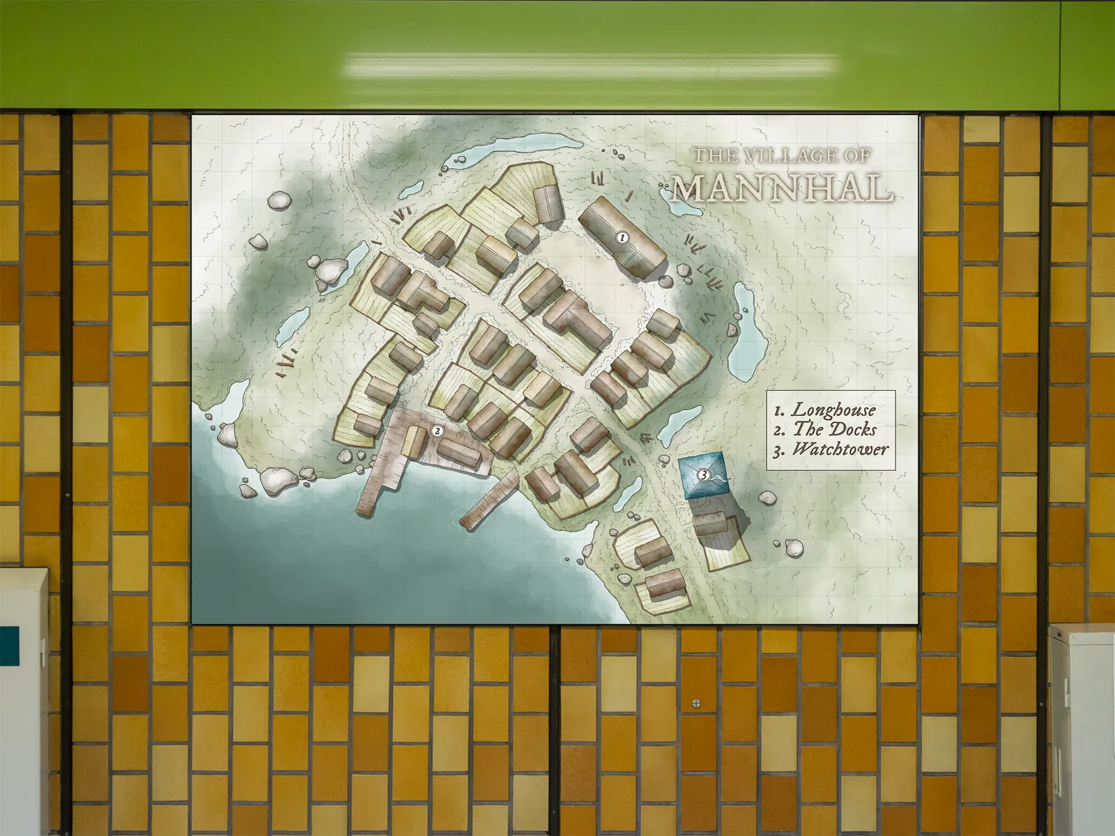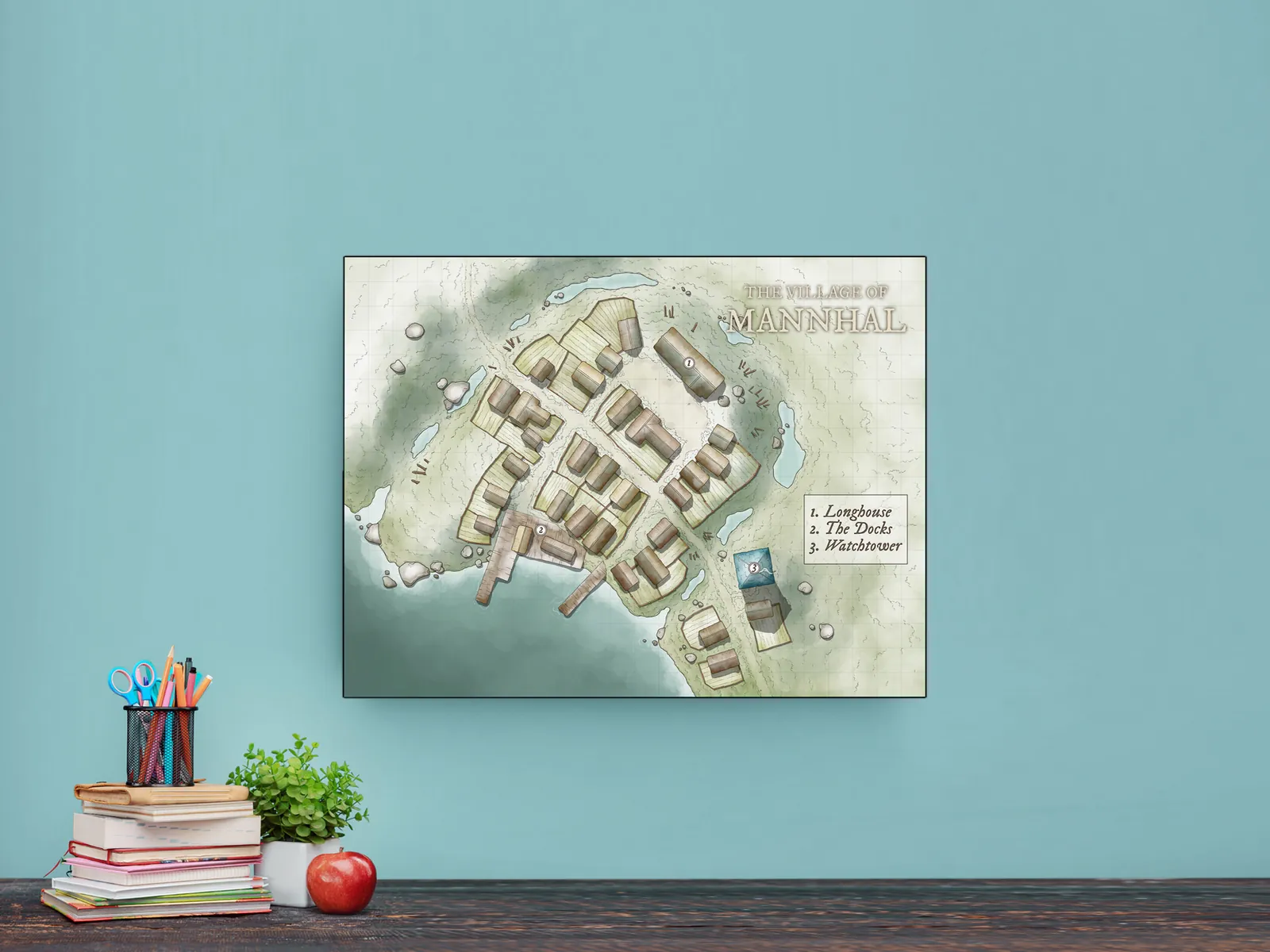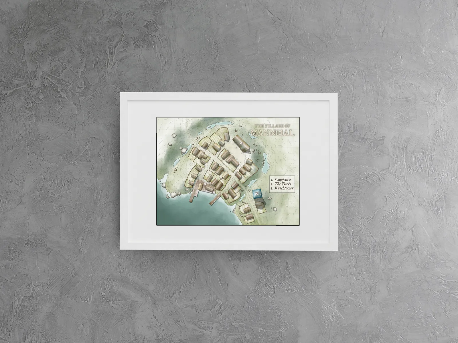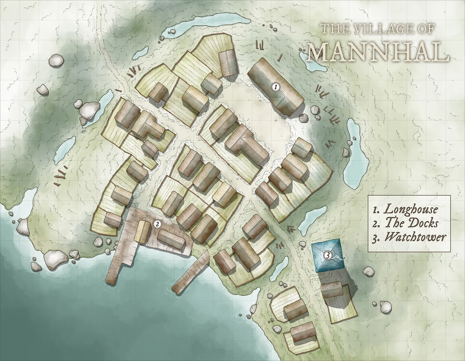 The Village of Mannhal Fantasy Map presents a compact coastal settlement arranged around winding paths, clustered longhouses, and a sheltered shoreline. The overhead layout clearly shows how homes, docks, and communal spaces connect. As a result, the village immediately feels practical, lived-in, and grounded in its environment.