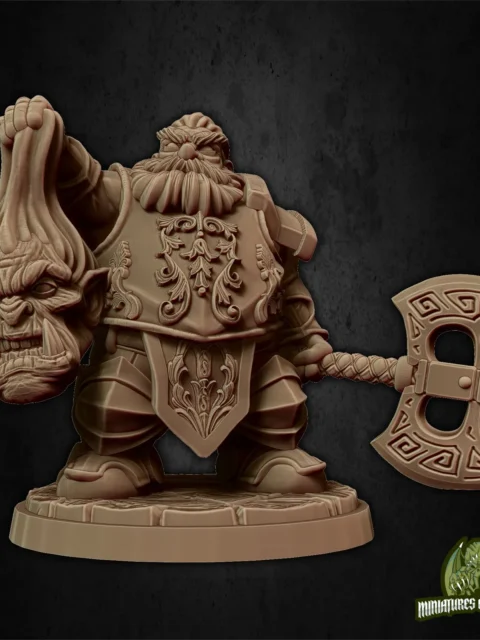 Additionally, his right arm raises the severed orc head by its hair while his left grips the double-bladed axe. The baroque scrollwork across his copper-trimmed chest plate catches light where the filigree deepens into shadow. Indeed, his beard flows in deeply carved horizontal ridges that demand careful wash control.