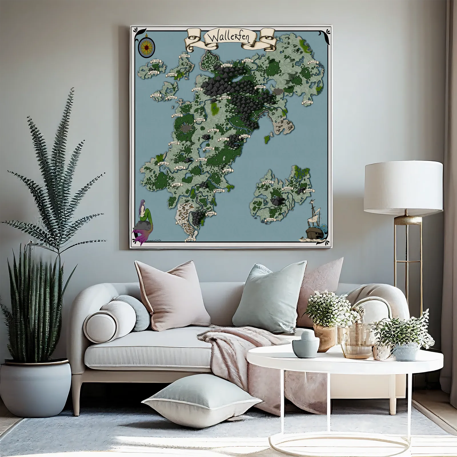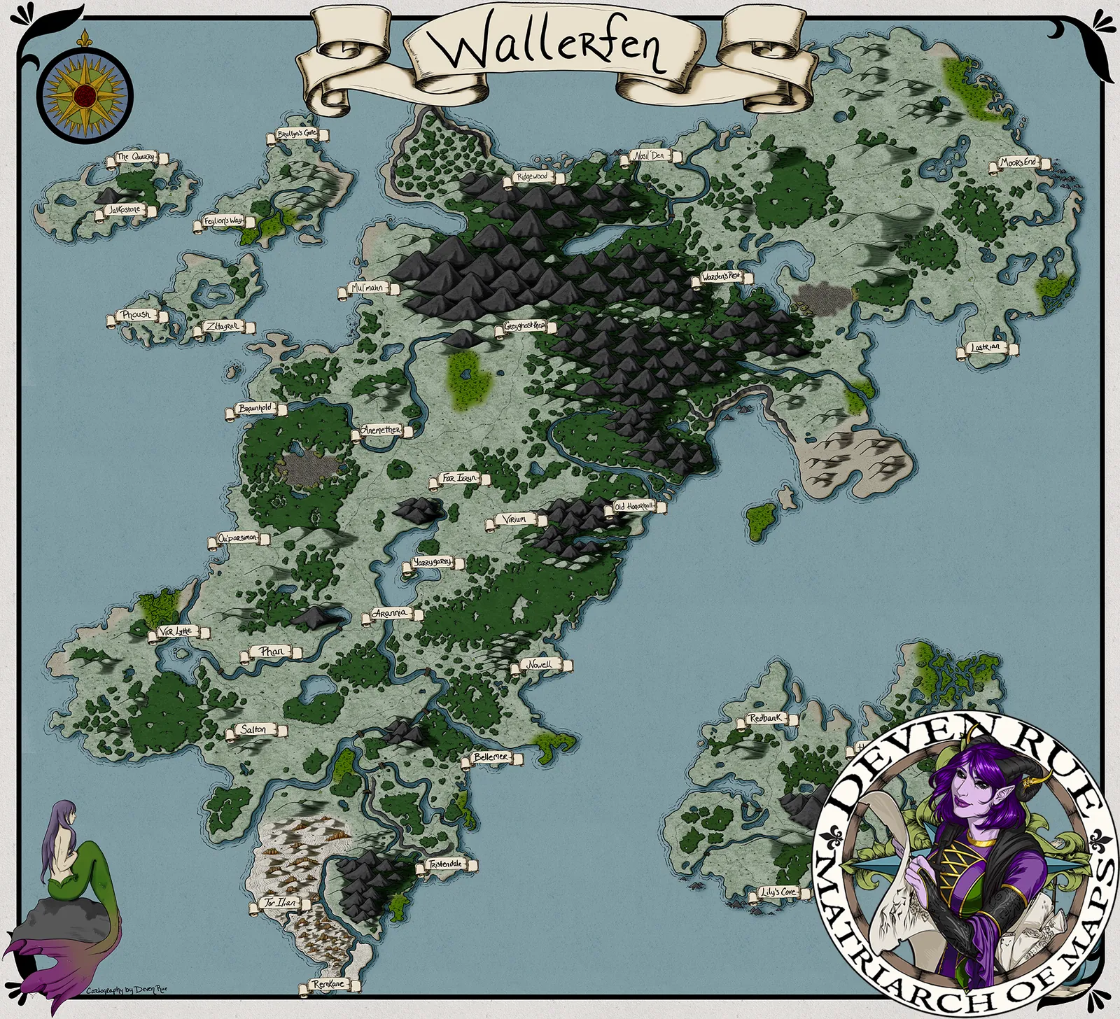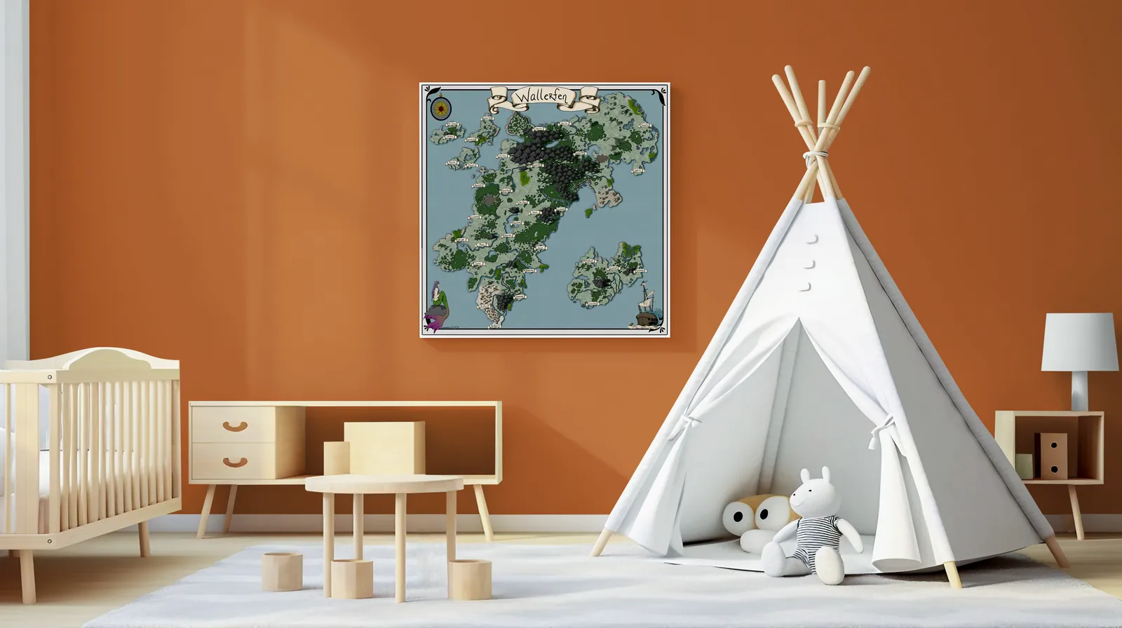 Wallerfen Map presents a sprawling realm of rugged mountains, winding rivers, and scattered settlements that suggest constant negotiation between nature and power. For those interested in unique decor, the Wallerfen Map gallery canvas wall art beautifully captures this dynamic landscape. Moreover, the dense highlands and branching waterways imply contested travel and guarded borders. Consequently, tension emerges from geography rather than visible conflict.