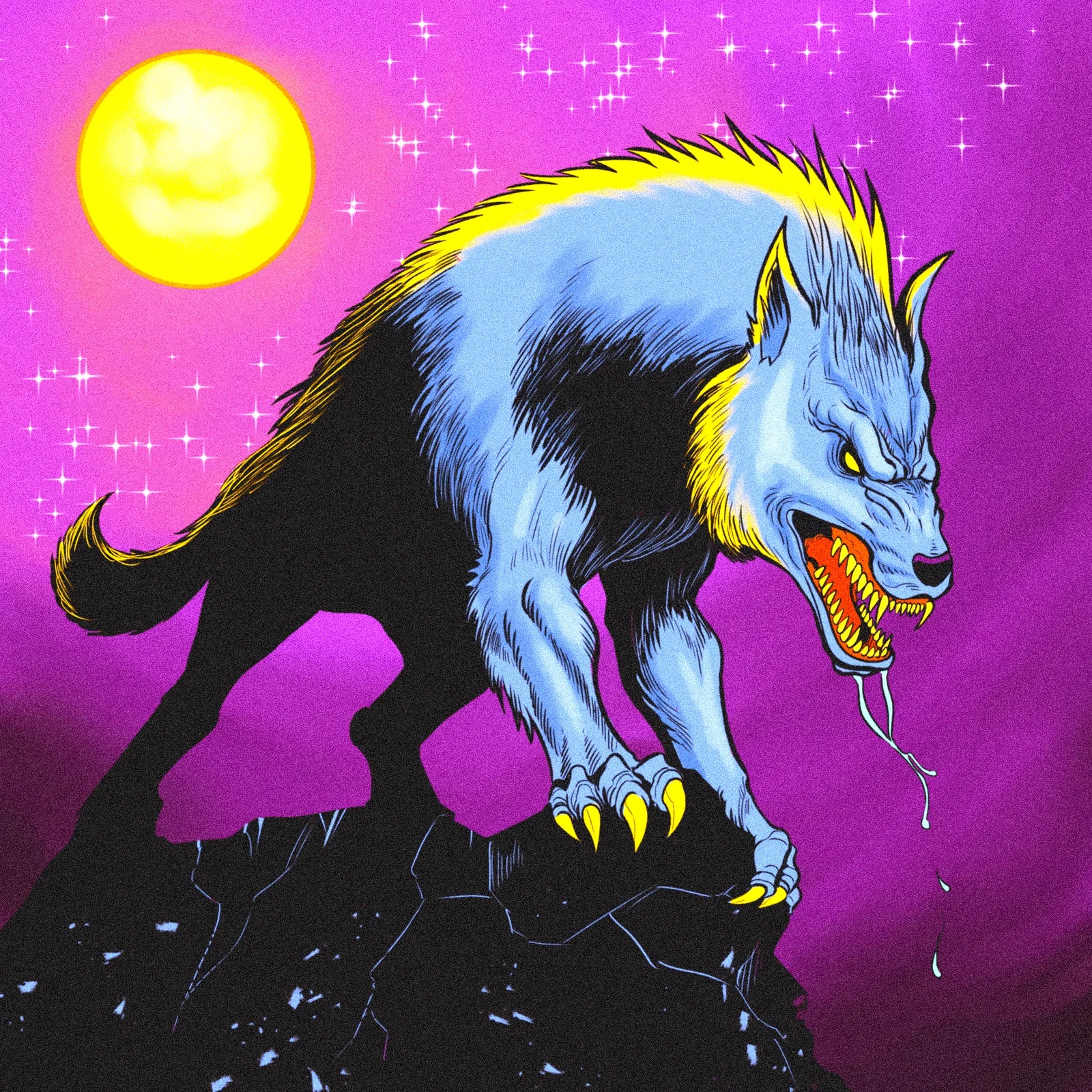 Additionally, the magenta-purple night sky saturates the background with retro pulp intensity. Bold black outlines define every tooth, claw, and muscle with high-contrast precision. The glowing moon moreover anchors the composition in the upper left corner.