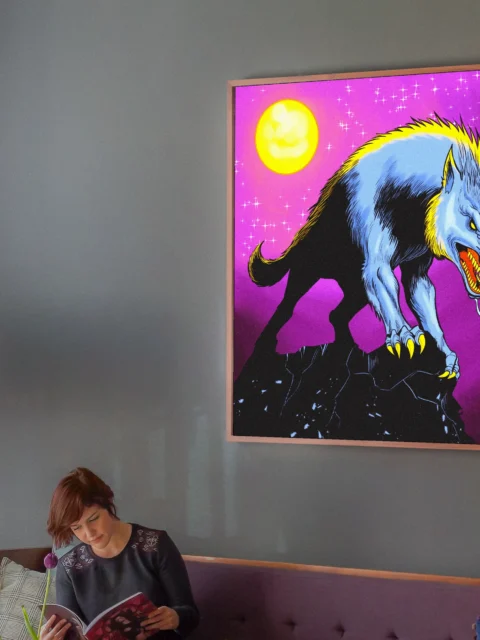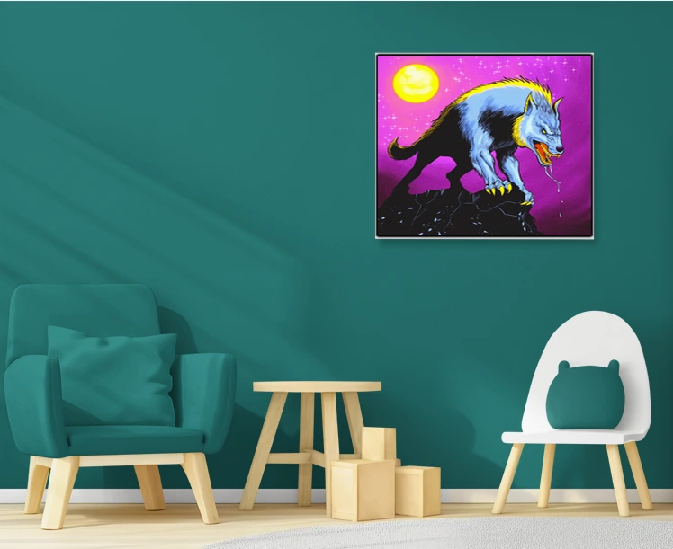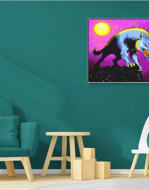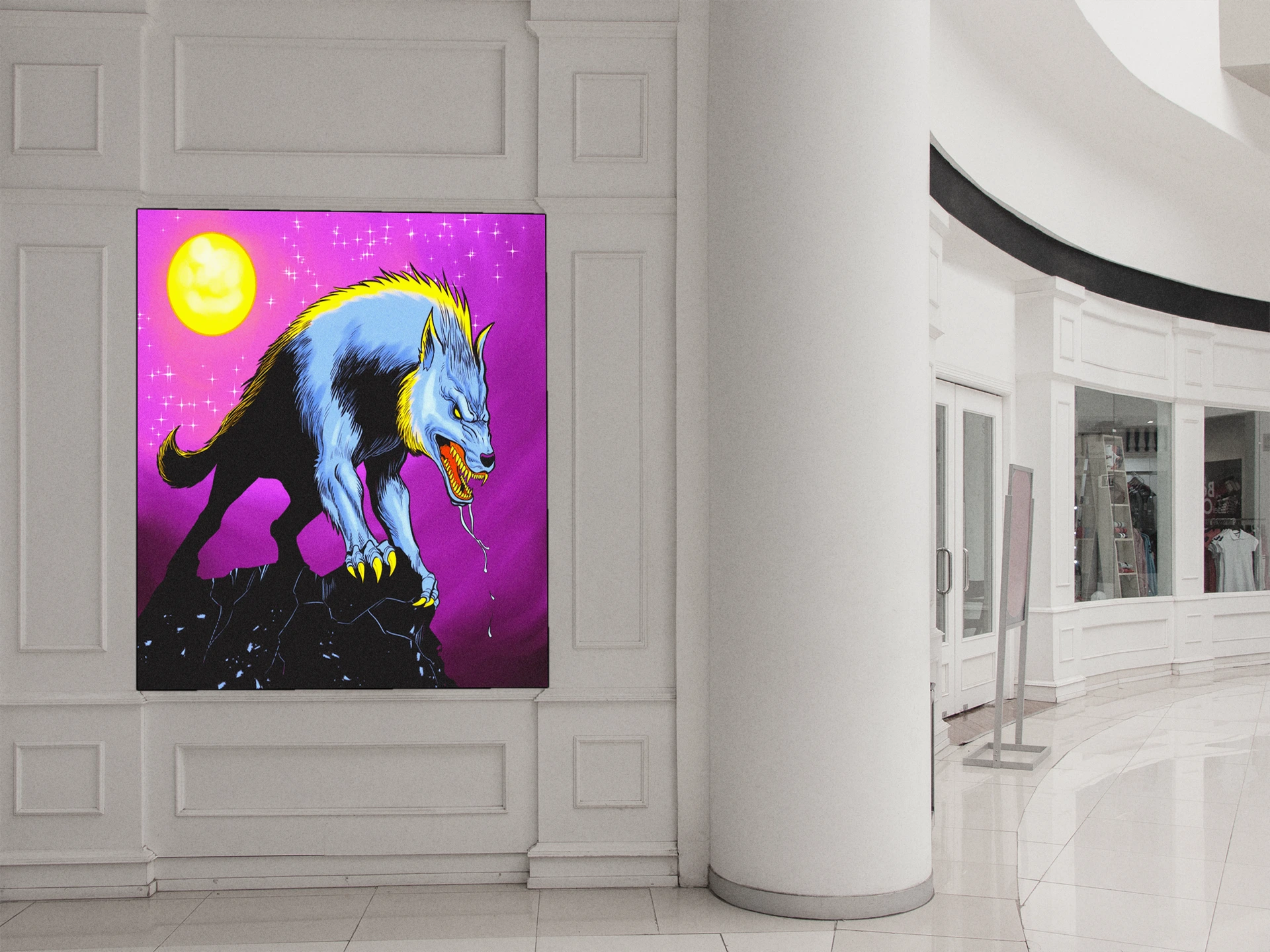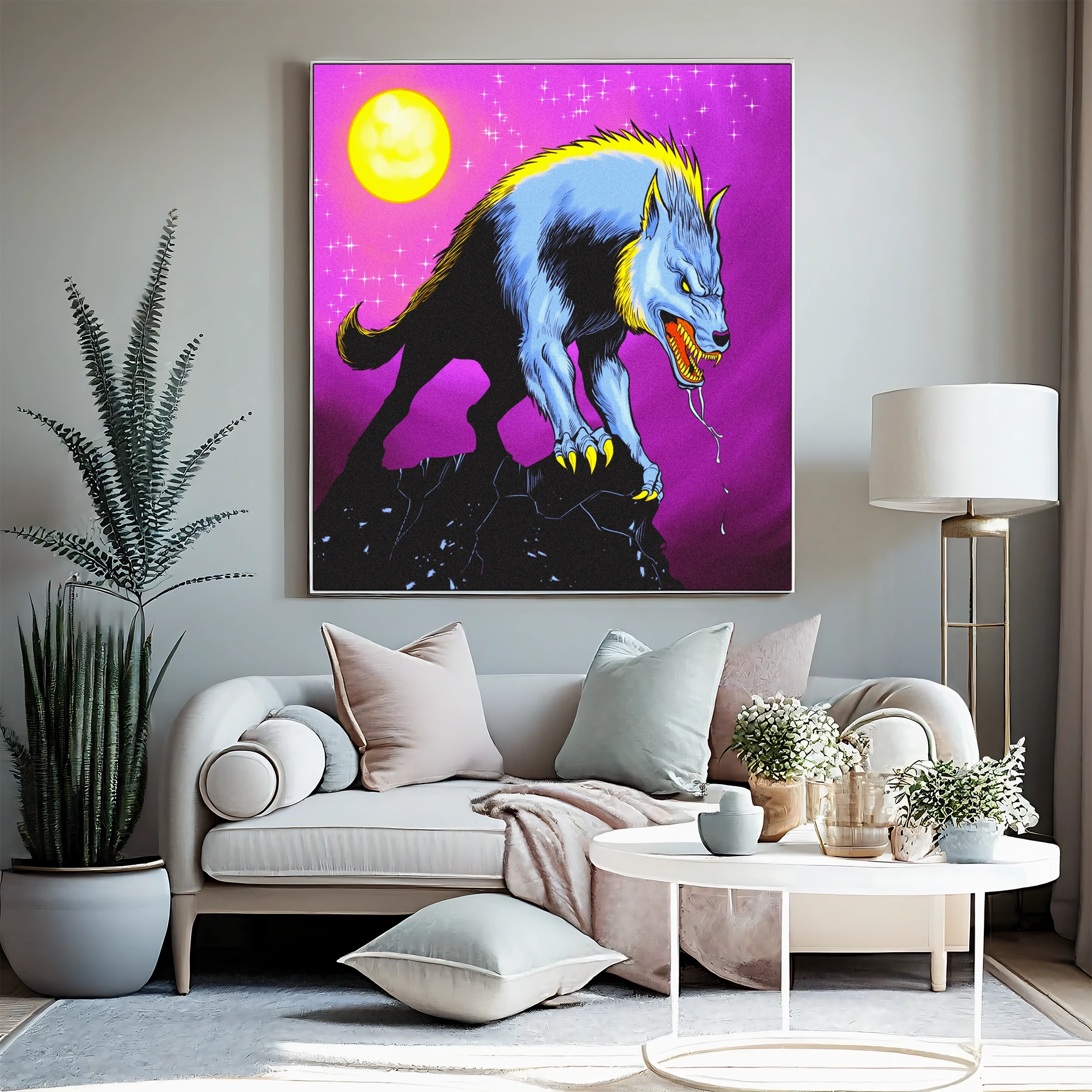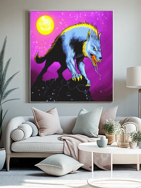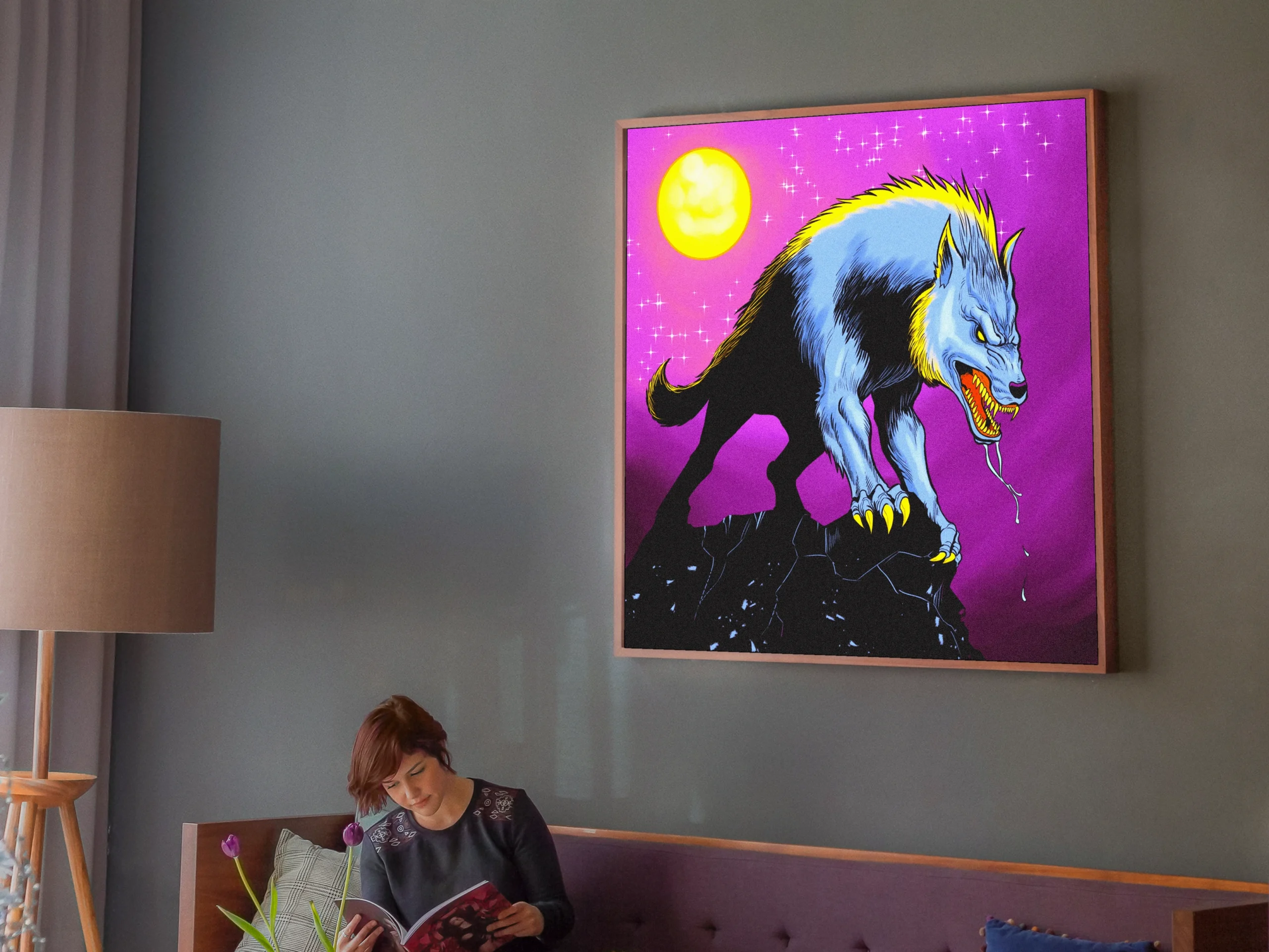 Mount this in tabletop gaming spaces where creature art sets the tone for horror campaigns. Additionally, it anchors fantasy illustration collections focused on lycanthrope and werewolf mythology.