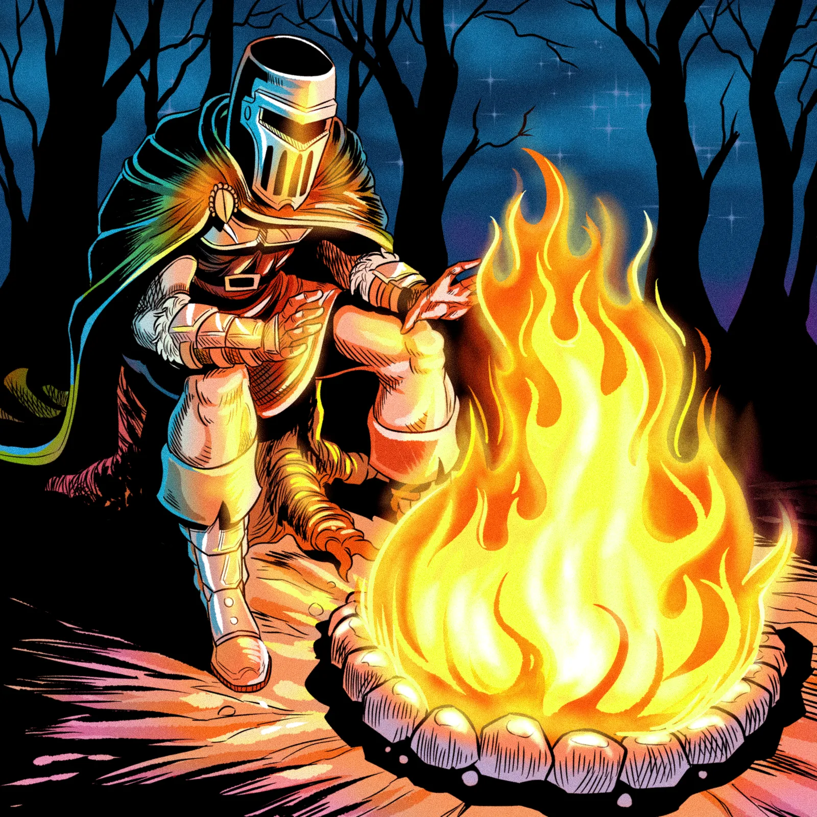 Additionally, the bonfire dominates with yellow-white core flames graduating to orange edges against stone pit embers. Cross-hatching textures the armor plates while bold black outlines define every contour. Moreover, silhouetted bare trees frame the composition against a star-flecked night sky.