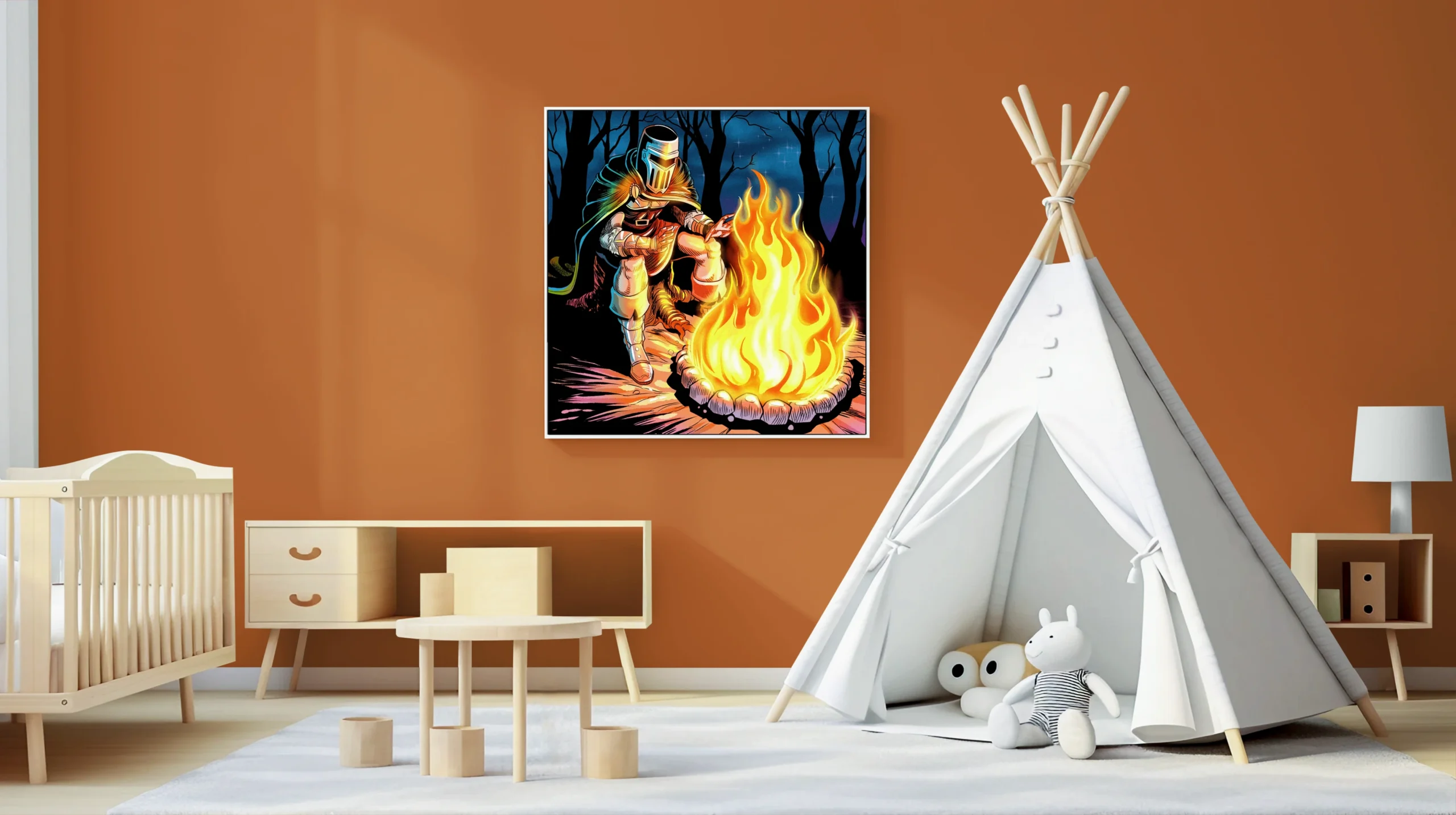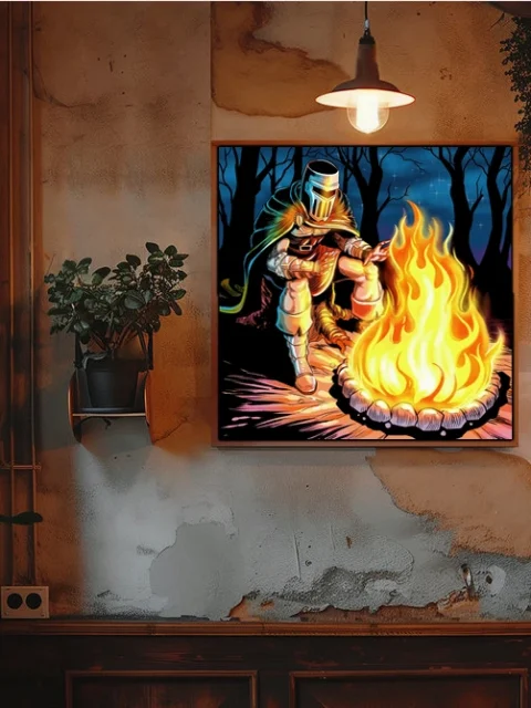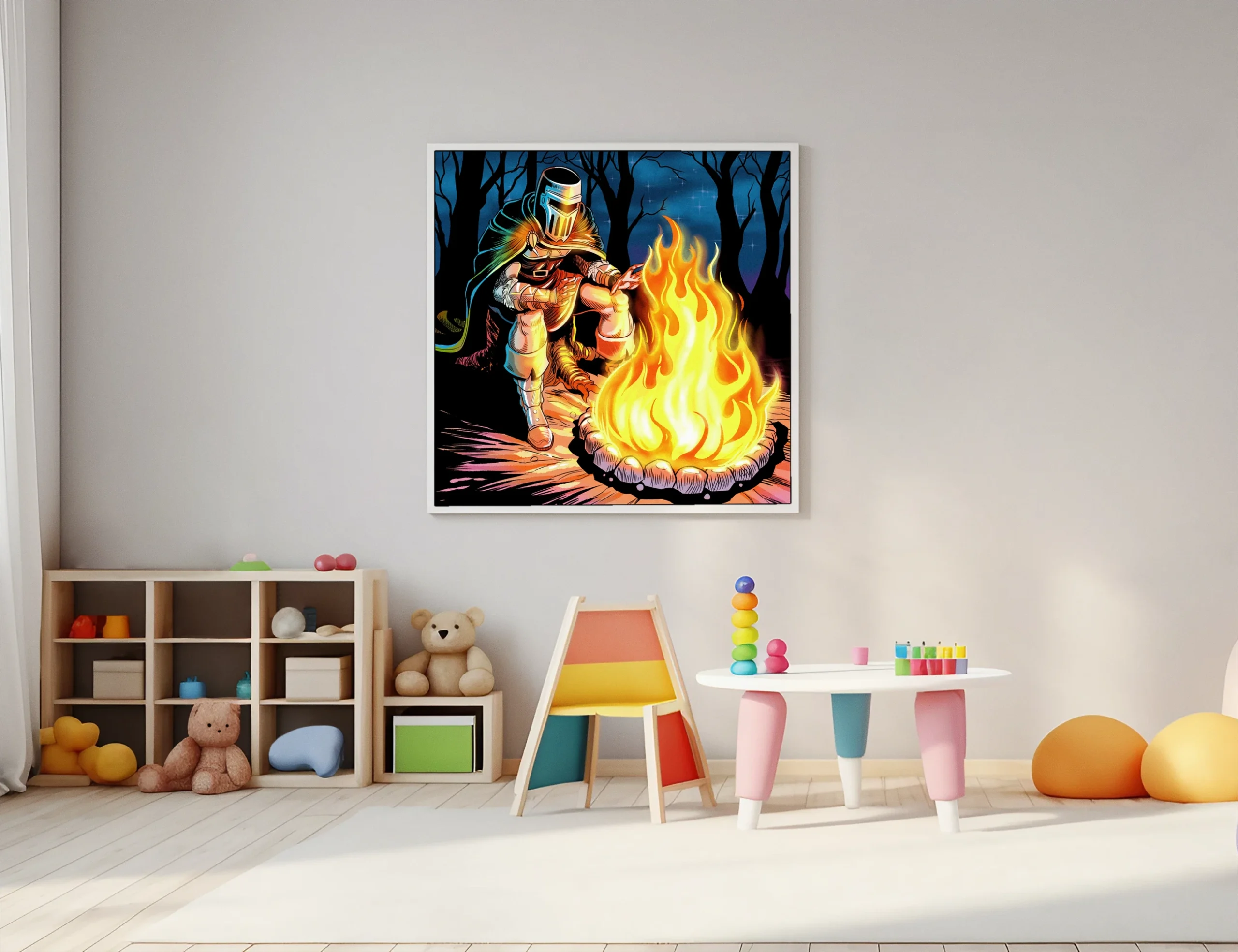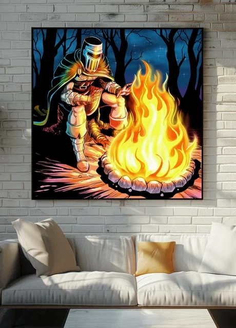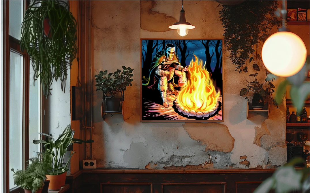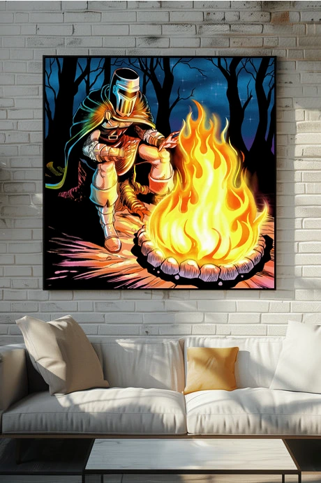 Display in game rooms where the contemplative knight moment pairs with tabletop setups and collector shelves. Additionally, the retro aesthetic fits creative studios seeking nostalgic fantasy illustration with bold color blocking.