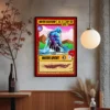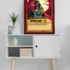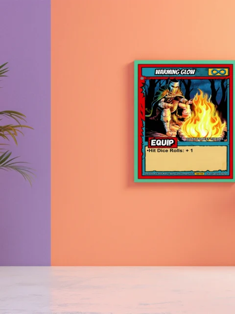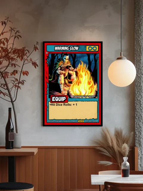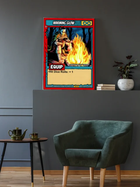 At room scale, the bold linework and high-contrast colors read clearly across a space. This warming glow trading card canvas print appeals to collectors who value retro gaming aesthetics. The comic book illustration style brings nostalgic fantasy tabletop energy to vertical wall arrangements.