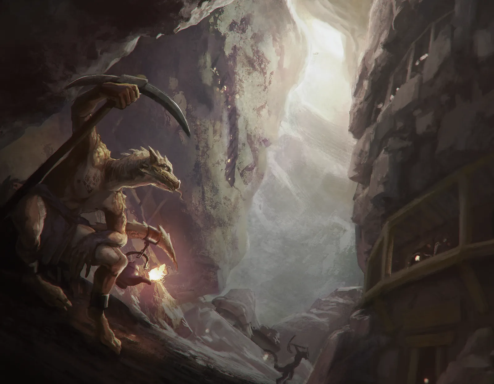 The composition funnels the eye through a narrow vertical shaft, emphasizing depth and claustrophobia. Additionally, the forward kobold dominates the frame while distant figures reinforce threat in layers. However, the hard stone walls keep motion contained, sharpening focus on the imminent clash.