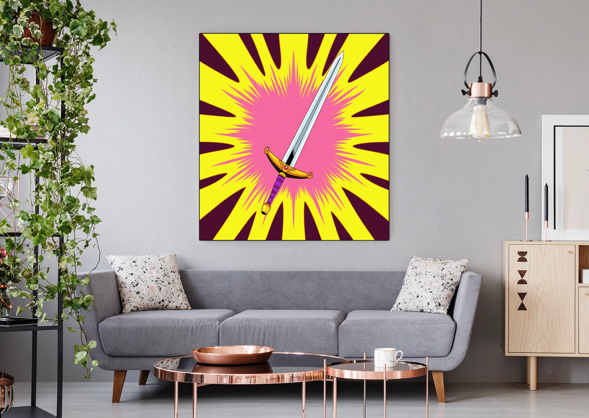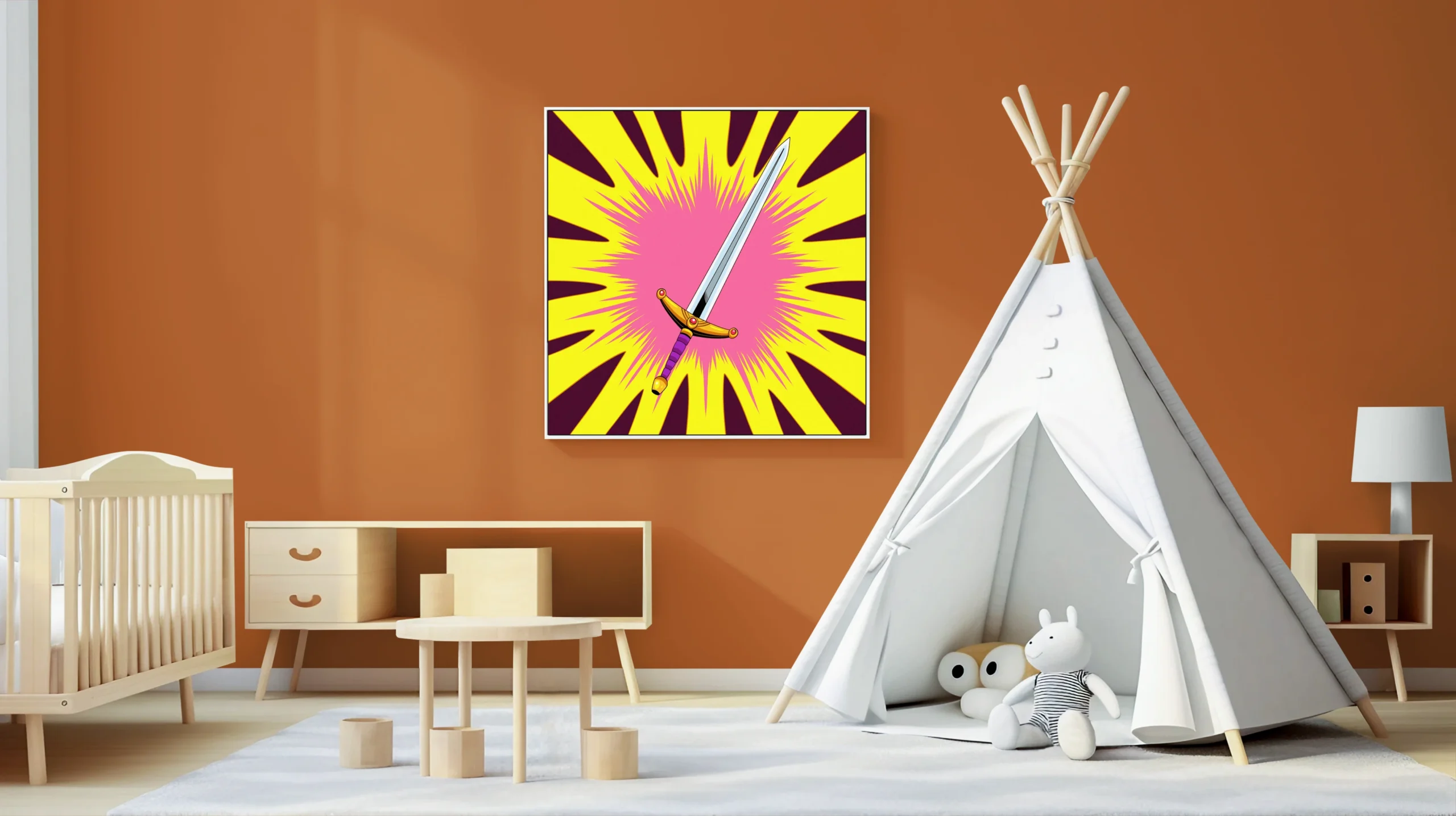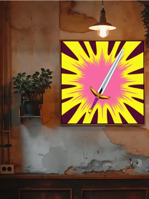 The bold geometry works in dedicated gaming spaces where weapon iconography reinforces competitive energy. Additionally, the vintage comic styling pairs with action figure displays and tabletop setups.